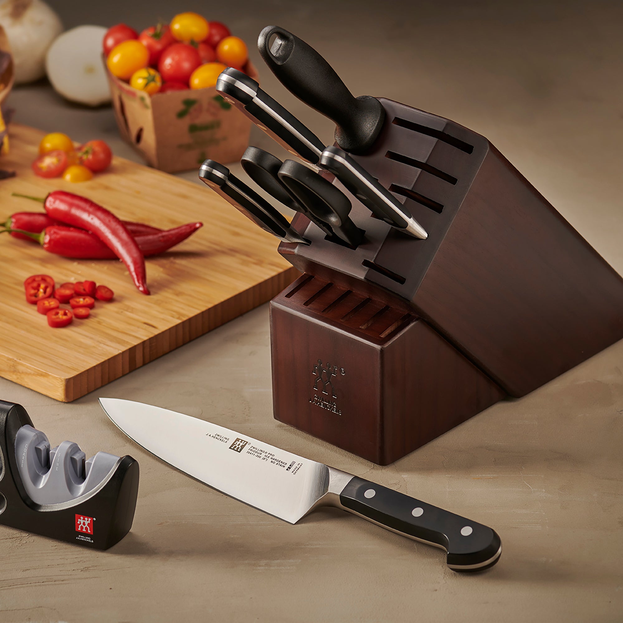 As we mentioned before, something to store your knives in, or on, is very important. Try this new and equally fantastic Zwilling Italian Round Magnetic Knife Block. The right wood or plastic cutting board is essential in caring for your knives. Try any end-grain wood cutting board from Larch Wood. DO NOT use steel or glass cutting boards please. There are sharpeners and sharpening stones like this Kramer Bamboo Sharpening Stone Sink Bridge.