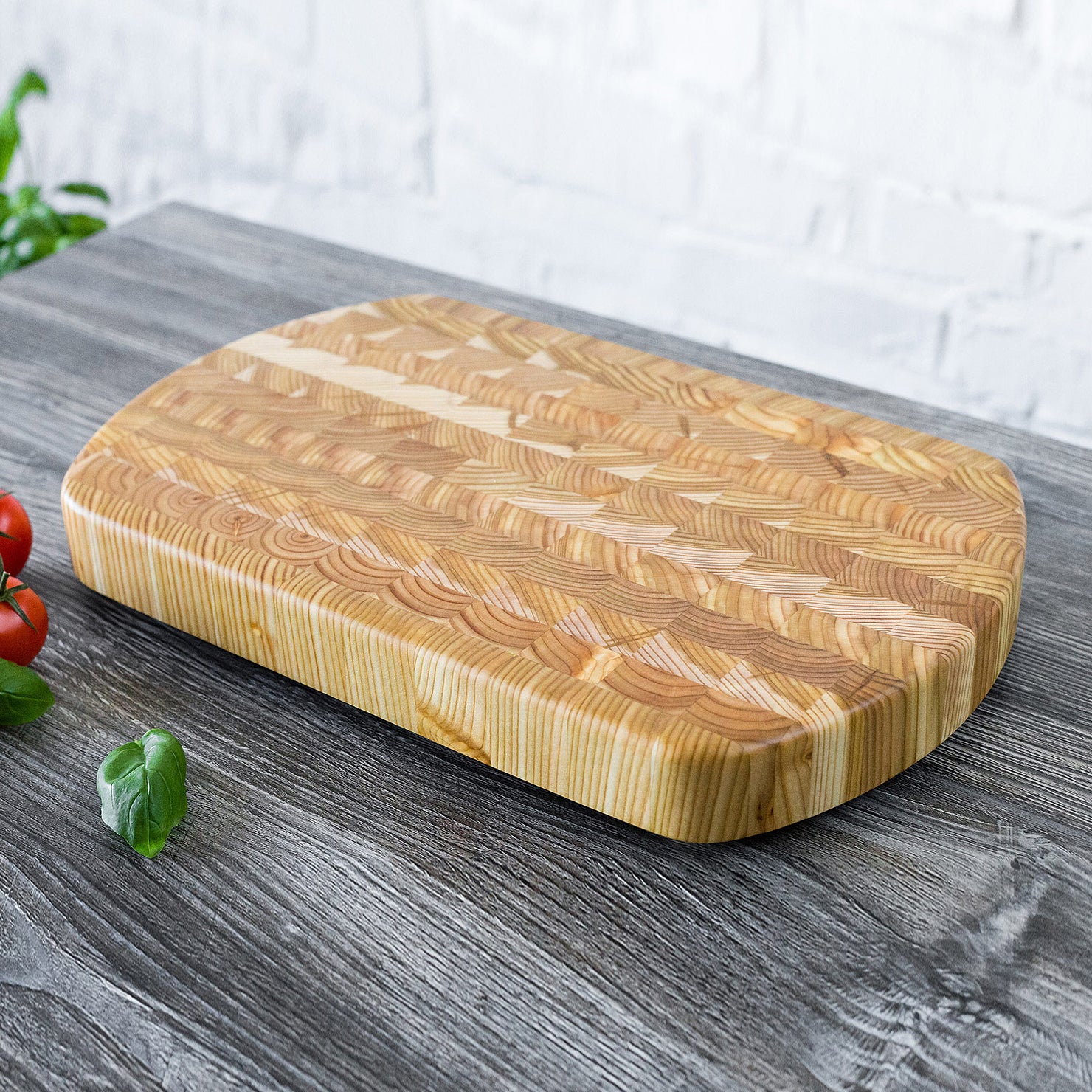 This board falls in the medium Larch Wood board category. It boasts a 17” length and 1.5” thickness. It is rectangular in nature but the long ends form about a quarter crescent rounded curve. Still the same easy-on-the-knives easy-on-the-eyes end-grain design. Just a little departure from the perfect rectangle.