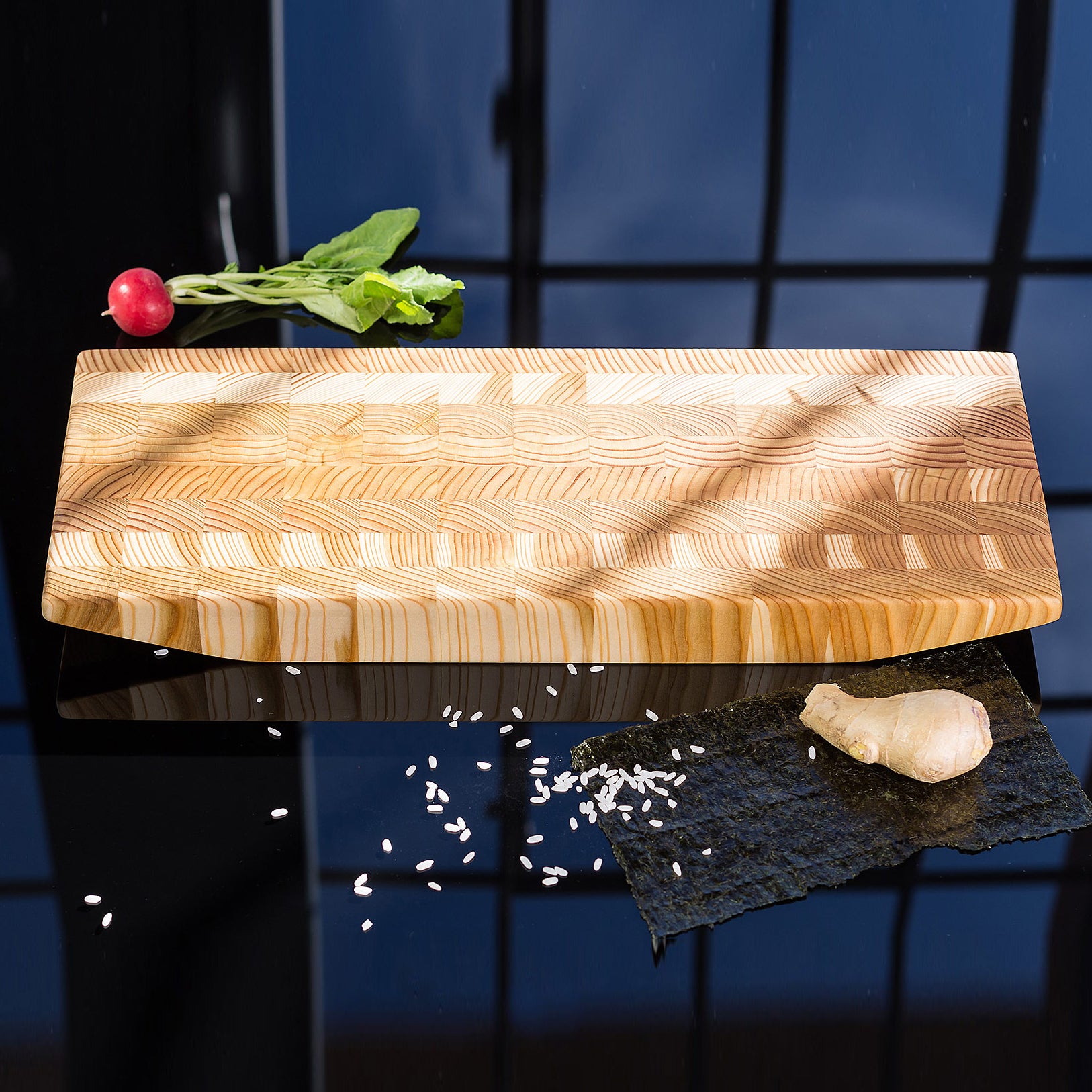 This board comes between a medium and large profile, one just being slightly longer than the other, with same width and depth. The two of them have a very distinct Japanese design that resembles residential Japanese architecture roof construction. Without going into an architectural history lesson, Japanese curved roofs were designed to distribute weight and forces more evenly, resulting in greater stability and resistance to external forces. That might not entirely be the structural integrity case here, but that is the inspiration for many sushi board designs throughout the world and so it is for the Larch Wood Ki Serving & Sushi Board.