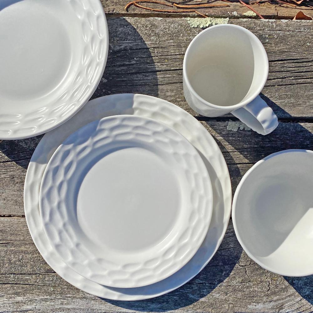 And just to further solidify our position that Truro is where Mr. Wainwright’s passion lies, he had to develop a line for those of us that might not need the metallic finishing rim around our bowls and plates. Truro Origin is a simpler version of the pattern that just allows the dimpling of the pebbles pattern speak for themselves. It comes in cornerstone place setting pieces so that, if one were so inclined, they could use the other Truro metallic pieces for centerpieces. The Truro Origin pieces come in a dinner plate, a salad plate.