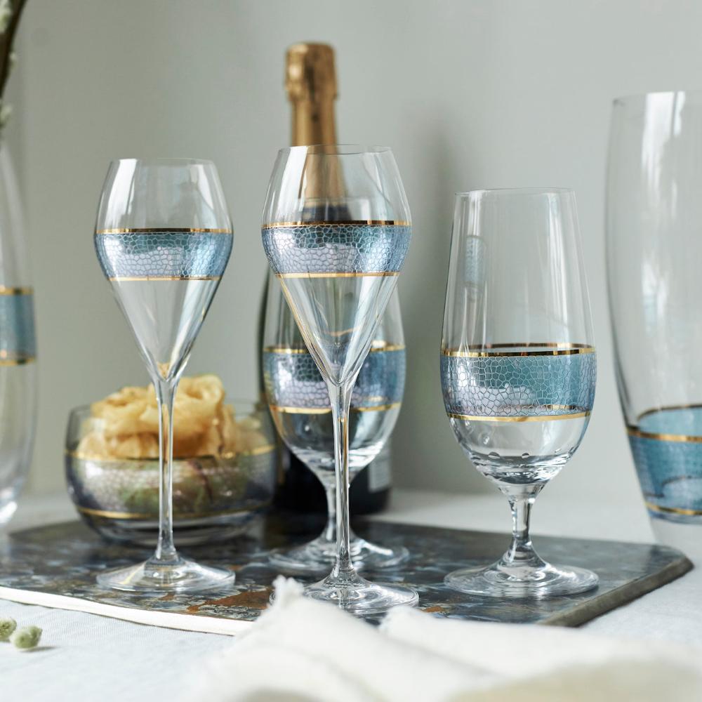 All of the Michael Wainwright Panthera Indigo Blue pieces are based on a mottled indigo blue glaze and a sleek 24k gold edge for a touch of bling. The glaze is reactive so no two pieces are the same. Mr. Wainwright is a student of the Japanese school of Wabi Sabi. Which is the celebration of all things beautifully imperfect. So every element, from the variations in the pattern to the thickness of the glaze, are unique and irregular. Rendering them perfect. The highlights of the Panthera Indigo collection are the serving tray and the chip and dip. Accompanying those serving pieces are the 10” round bowl and the 5” square bowl. The entire Panthera Indigo collection rounds out well with the wine glasses, the water glasses and the double old fashioned glasses.