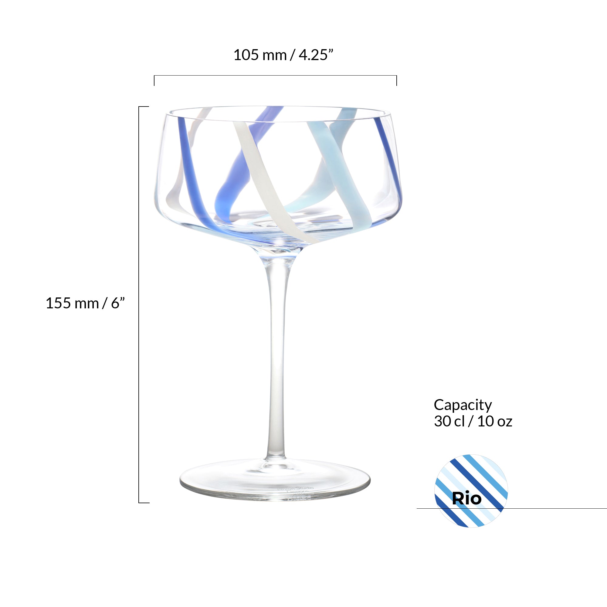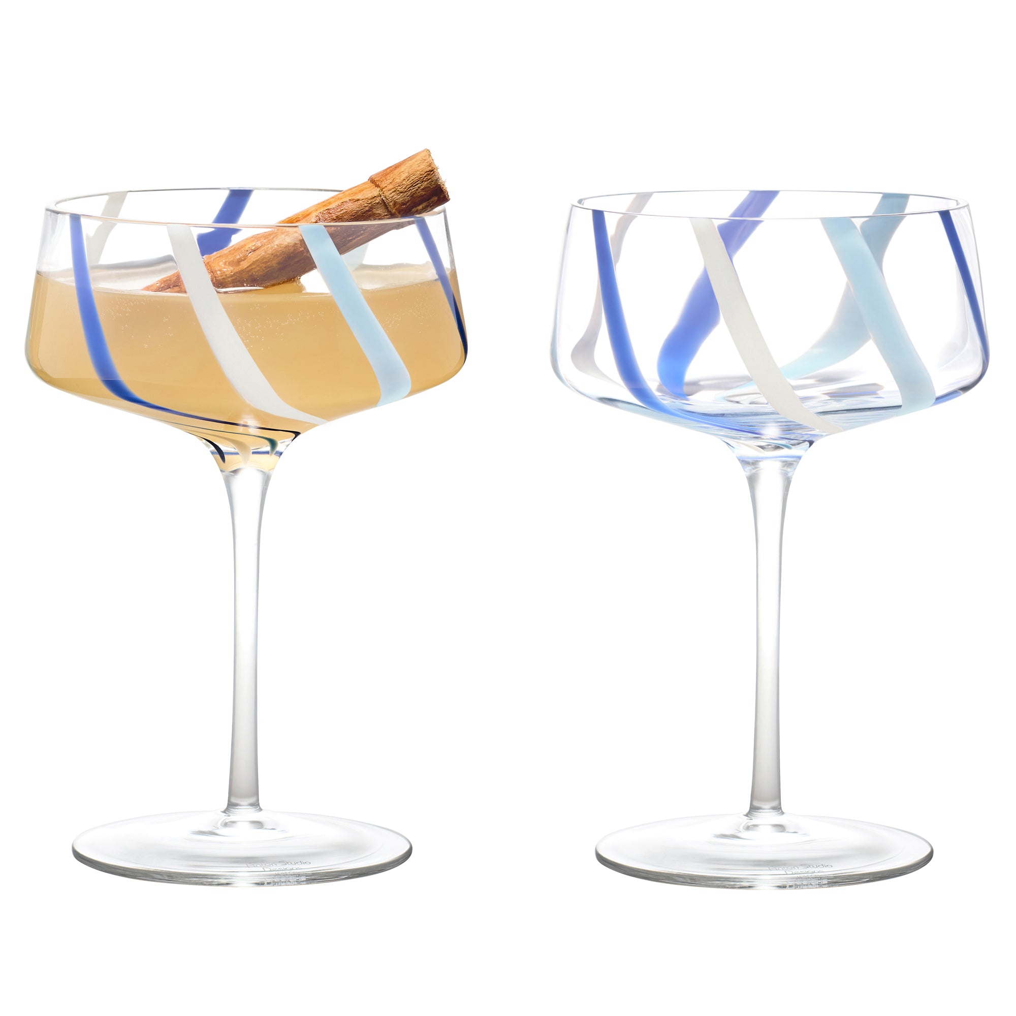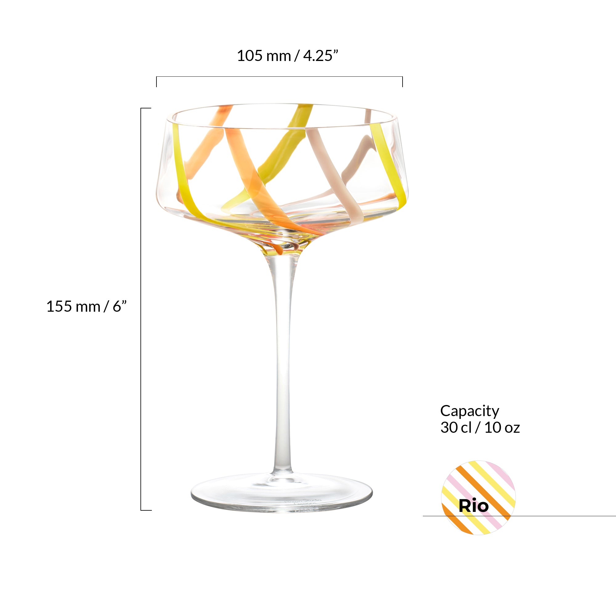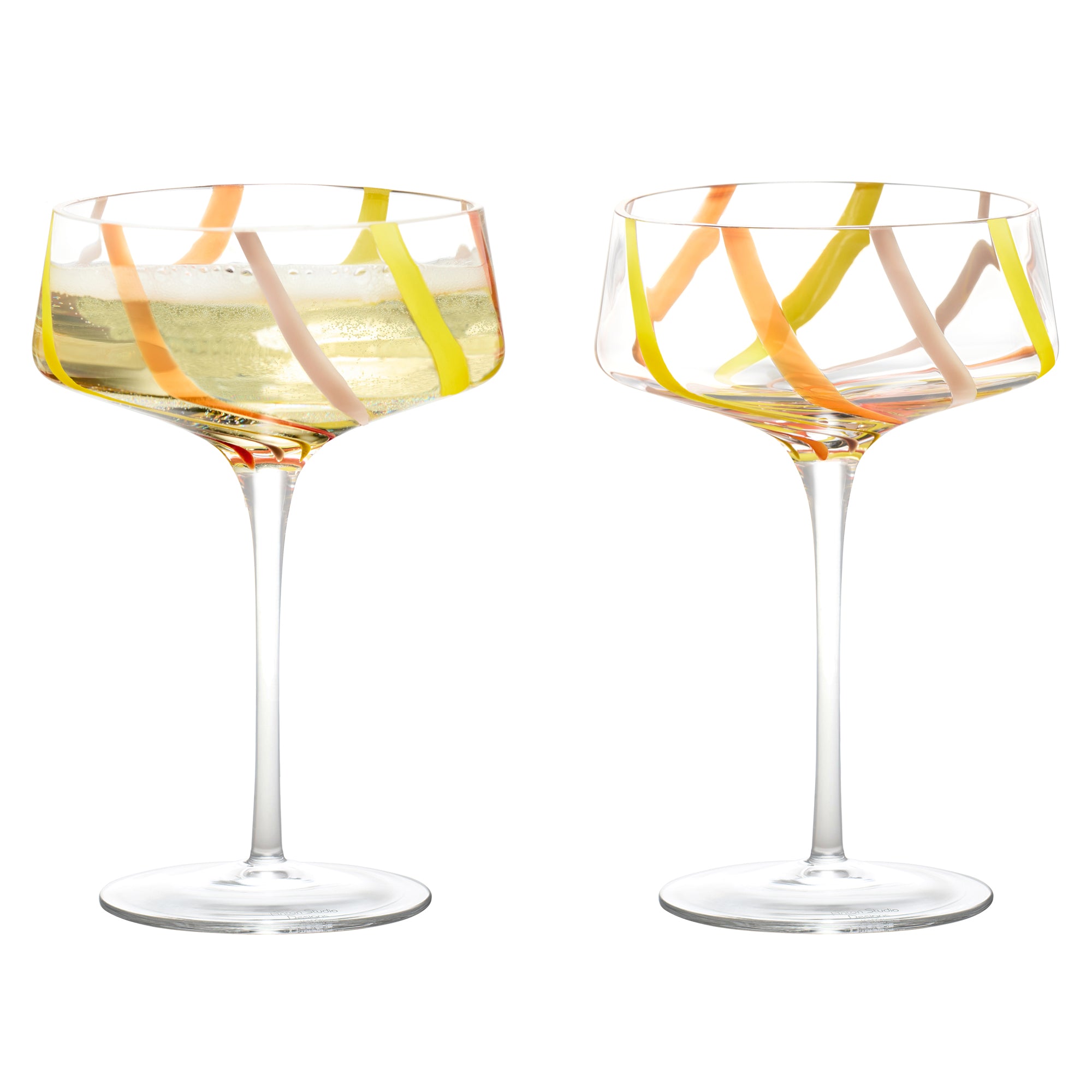 A celebration of colour and form, the Anton Studio Designs Set of 2 Rio Champagne Coupes brings bold energy to the table. Hand-applied diagonal bands swirl around the tall, angled bowl, tapering inward for a modern silhouette with playful sophistication.
