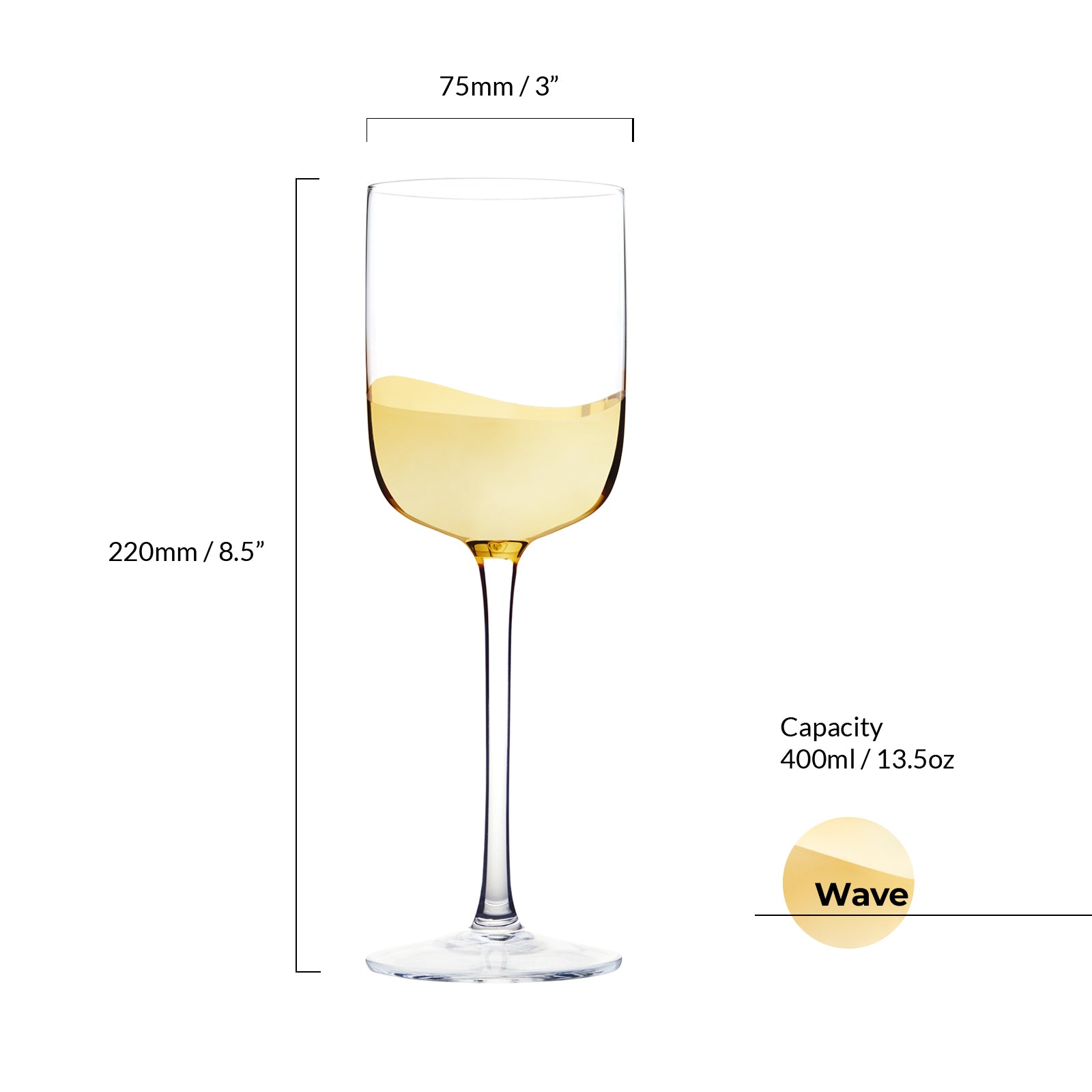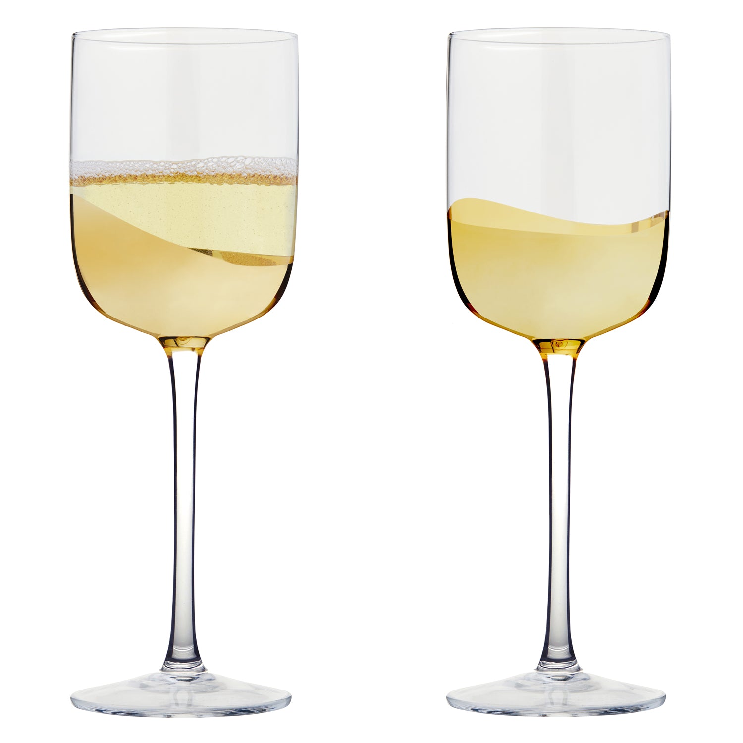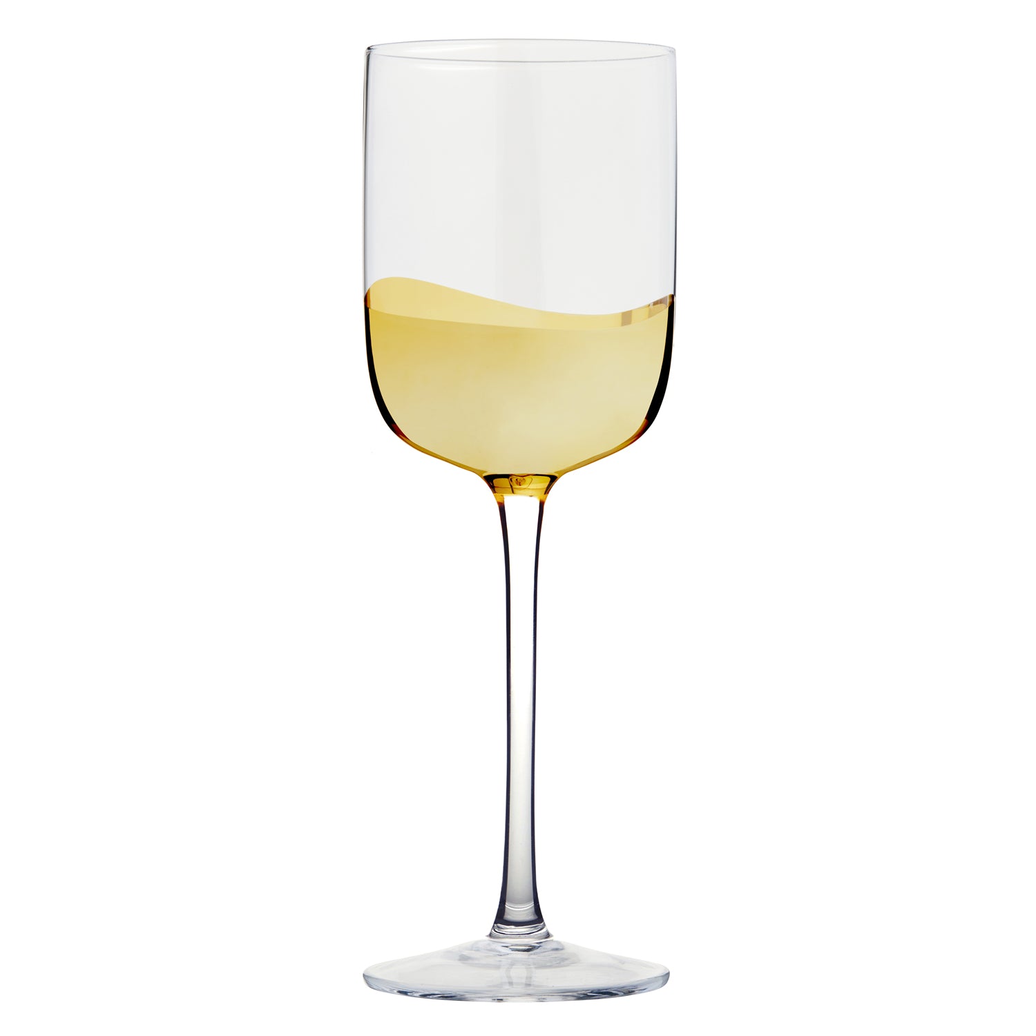 Upgrade your beverage presentation with Wave Gold Wine Glasses from Anton Studio Designs. Taking its name from the tidal, metallic peaks ebbing and flowing around each glass creating the wave look, this design is a stylish way to add a metallic touch to any barware collection. The brightly polished gold wave gently rises and falls as it makes its way around the glass, giving a beautifully reflective, mirrored finish. These glasses are sure to impress, perfect for entertaining guests or simply enjoying a glass of wine at home.
