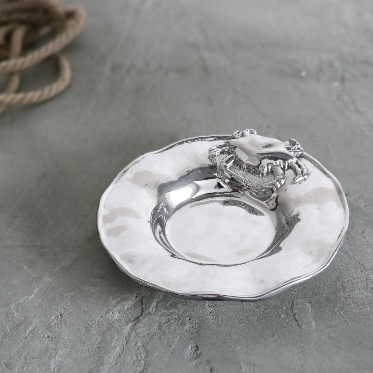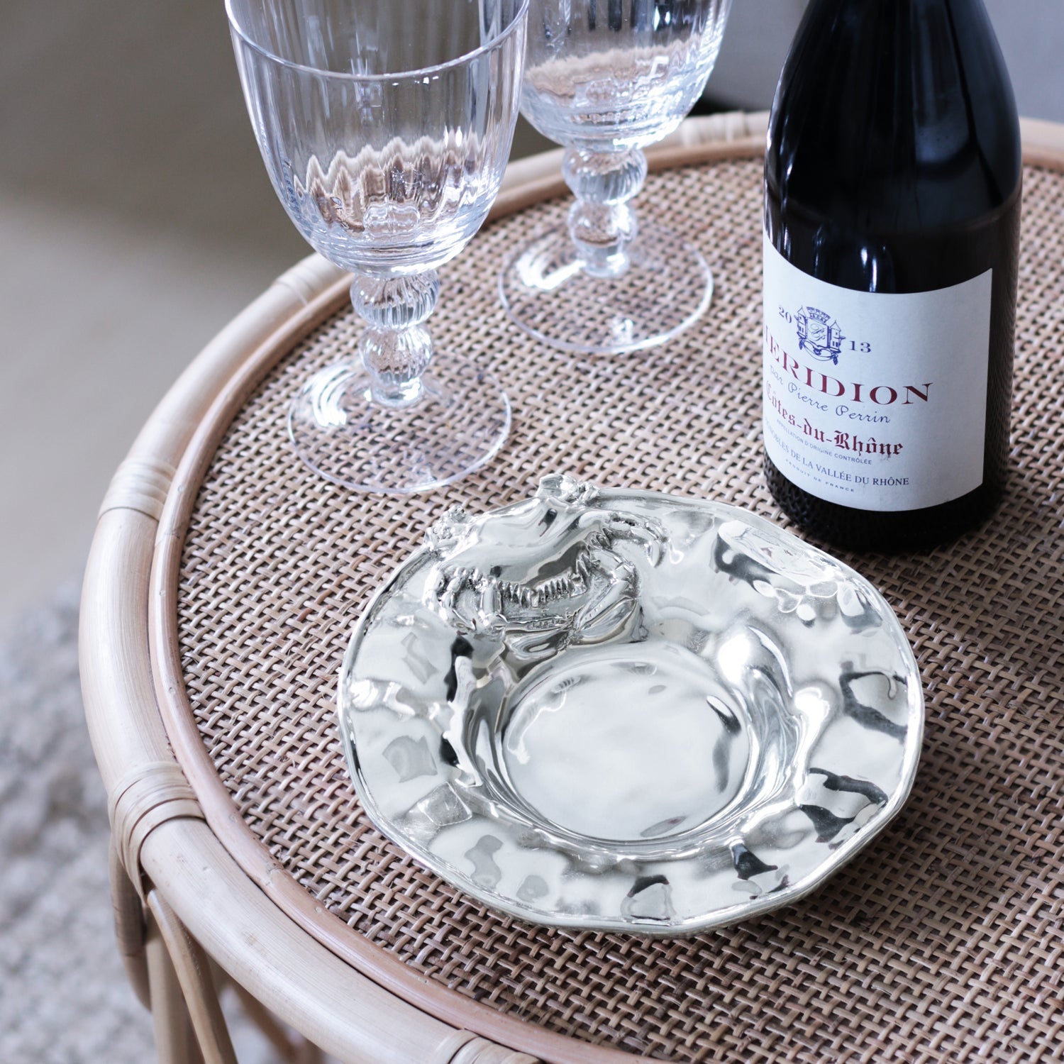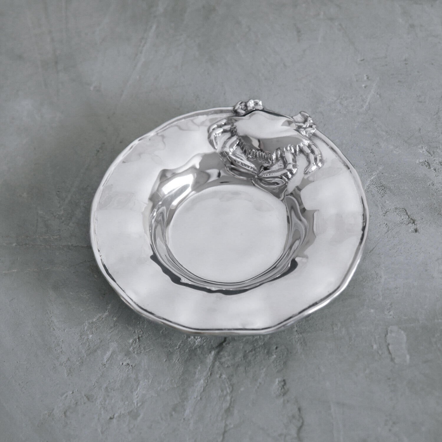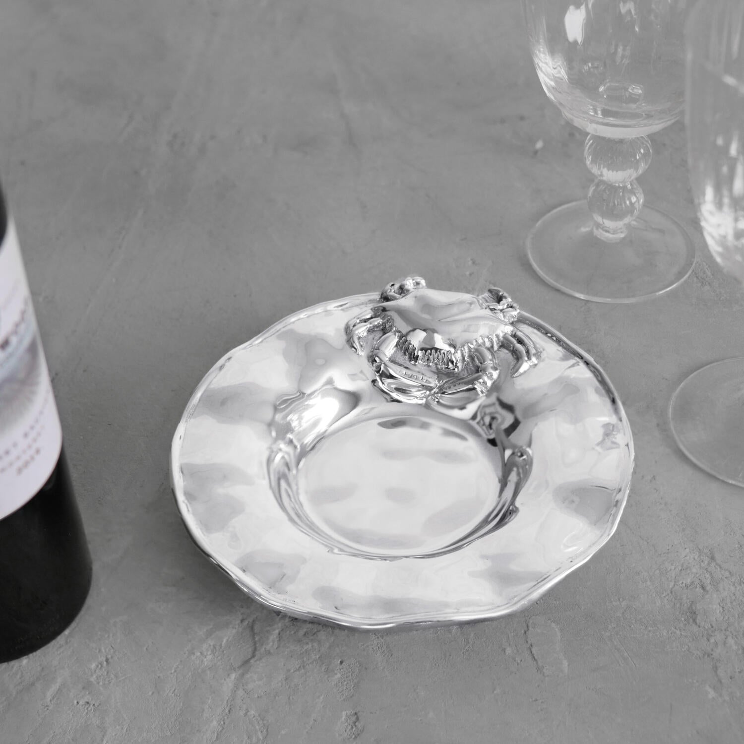 • Design: sculptural miniature crab atop a gleaming wine coaster
