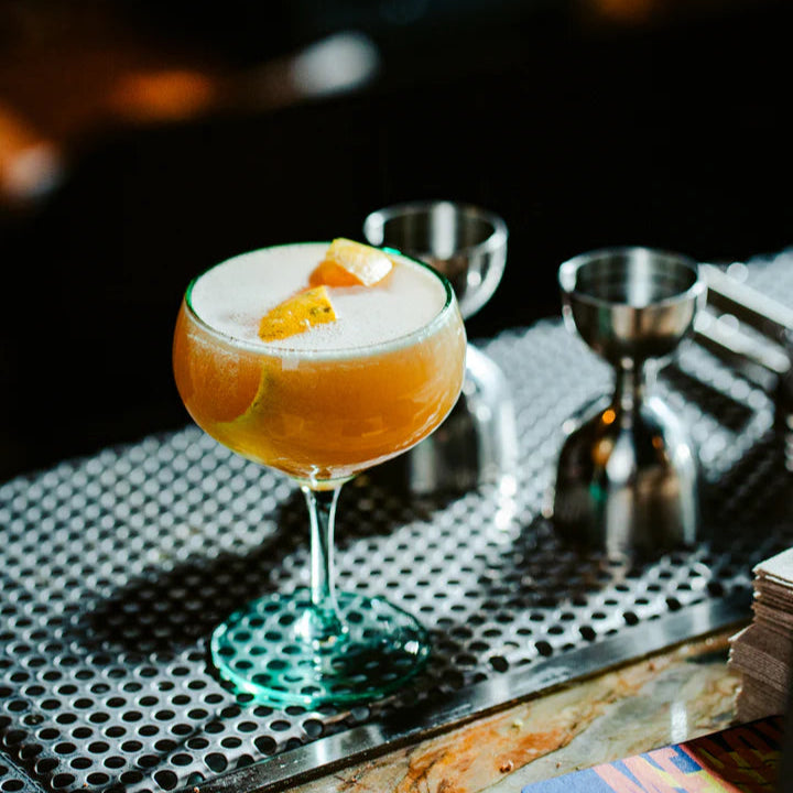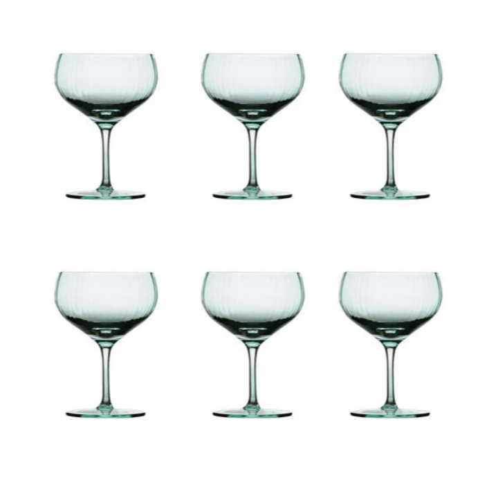 The Legend Eco Hawthorne 5.5 oz. Sweet Coupe, Set of 6, marries eco-conscious design with elegant craftsmanship. Handmade from recycled glass, each glass features a sheer rim and subtle colored finish that brings every drink to life.