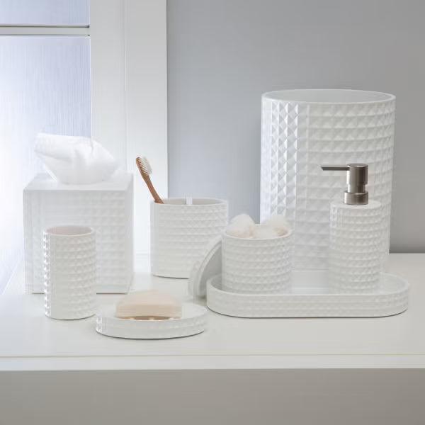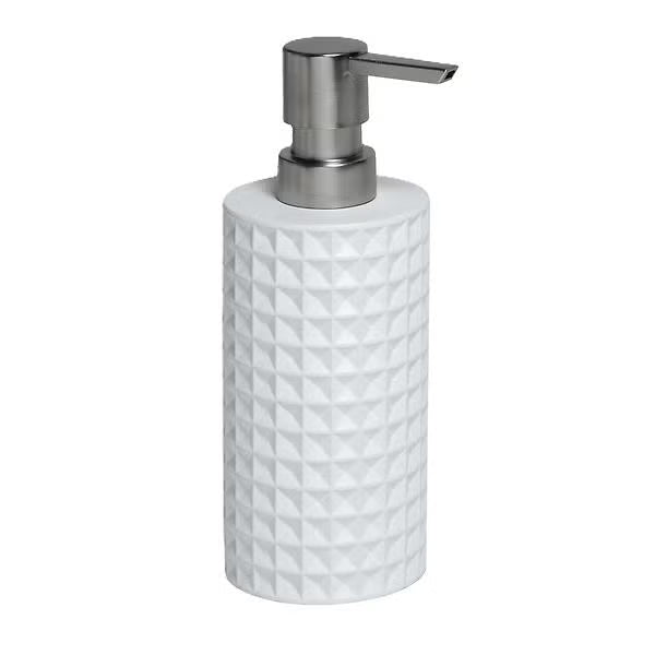 The Moda At Home Braemar Resin Lotion Dispenser features a refined waffle pattern that adds striking visual texture and contemporary style to your bathroom décor. Meticulously crafted from durable resin, it combines modern aesthetics with timeless elegance. Its sleek profile and smooth finish create a sophisticated look while offering practical functionality for everyday use. Spot or Wipe Clean. 14 oz. capacity.