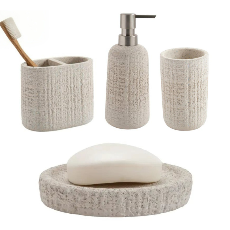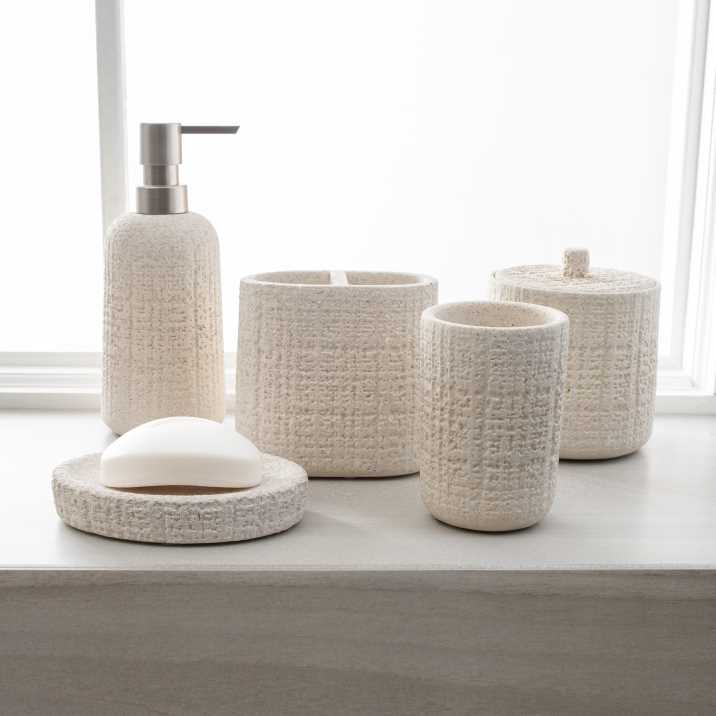 Together, they transform the countertop into a serene retreat with enduring beauty. Set includes Tumbler, Toothbrush Holder, Soap Dish, and Lotion Dispenser.