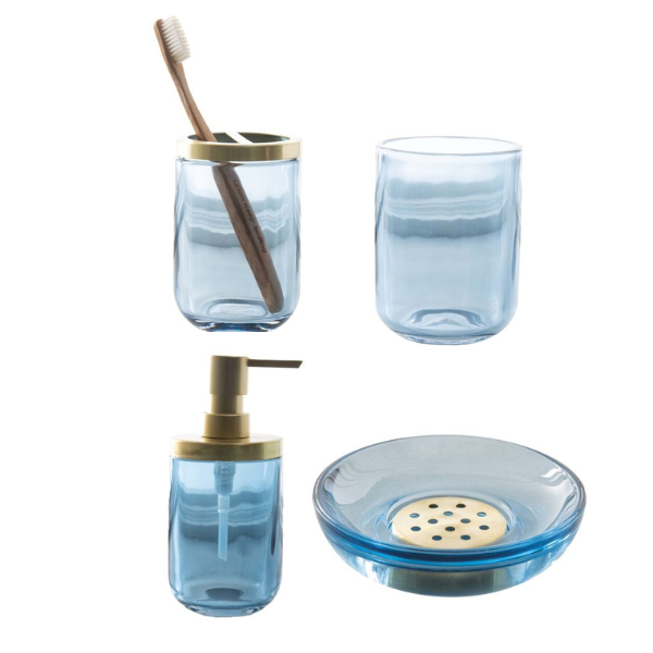 The Moda At Home Jasper Bathroom Accessory Set combines modern sophistication with everyday practicality, crafted from durable glass and accented with elegant gold details. The tumbler offers a refined way to organize essentials, while the toothbrush holder adds both function and luxury. The soap dish includes a removable drain for easy cleaning, and the lotion dispenser features a smooth pump with 9.5 oz. capacity.