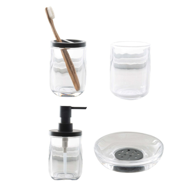 Designed to bring understated elegance to the sink or vanity, this set blends durability with timeless style. Set includes Tumbler, Toothbrush Holder, Soap Dish, and Lotion Dispenser.