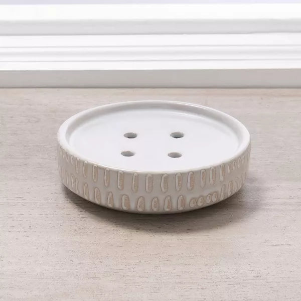 The Moda At Home Tunisia Ceramic Tumbler and Soap Dish bring rustic charm and refined elegance to the bathroom. Finished with a translucent milky glaze that reveals warm clay undertones, each piece highlights a subtle interplay of textures that blends modern design with primitive beauty.