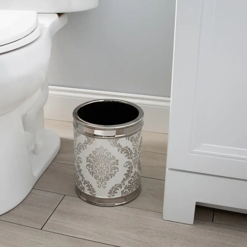 The Moda At Home Damask White and Silver Ceramic Waste Bin brings understated elegance to your bathroom with its delicate damask pattern set against a crisp white background. Accented by a silver base and rim, its electroplated ceramic construction offers durability and a refined finish.