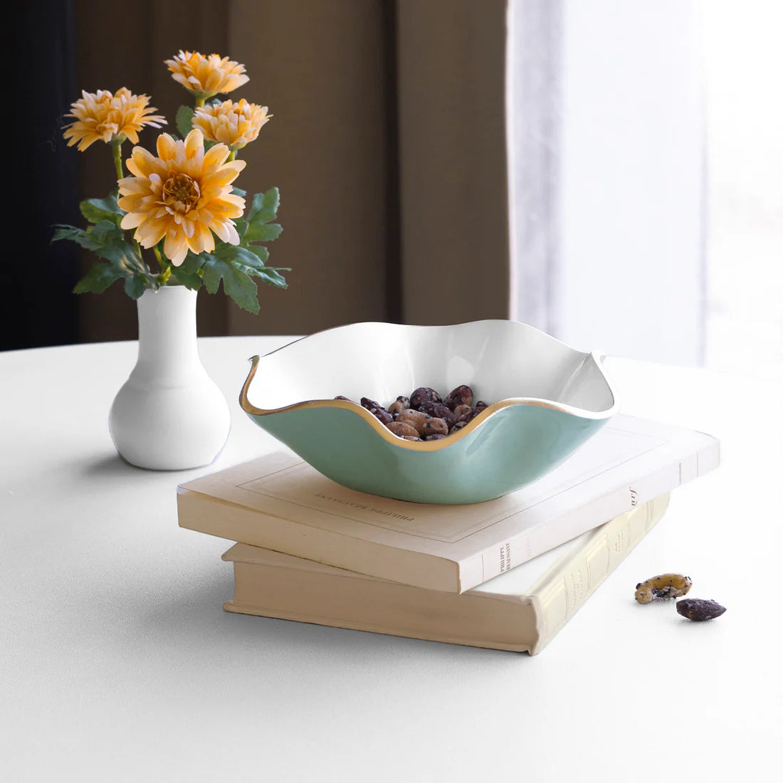 Distinctive for its curvy silhouette and two-tone enamel finish, the Beatriz Ball Encanto Carola Round Bowl features a hand-polished gold rim that adds elegance to any setting. Ideal for snacks, dips, or small bites, it’s crafted from high-quality aluminum alloy with a food-safe enamel finish. Over 20 artisan hands contribute to the creation of each bowl using an eco-friendly, handmade process. Dishwasher safe. Measures approximately 5.5" in diameter.