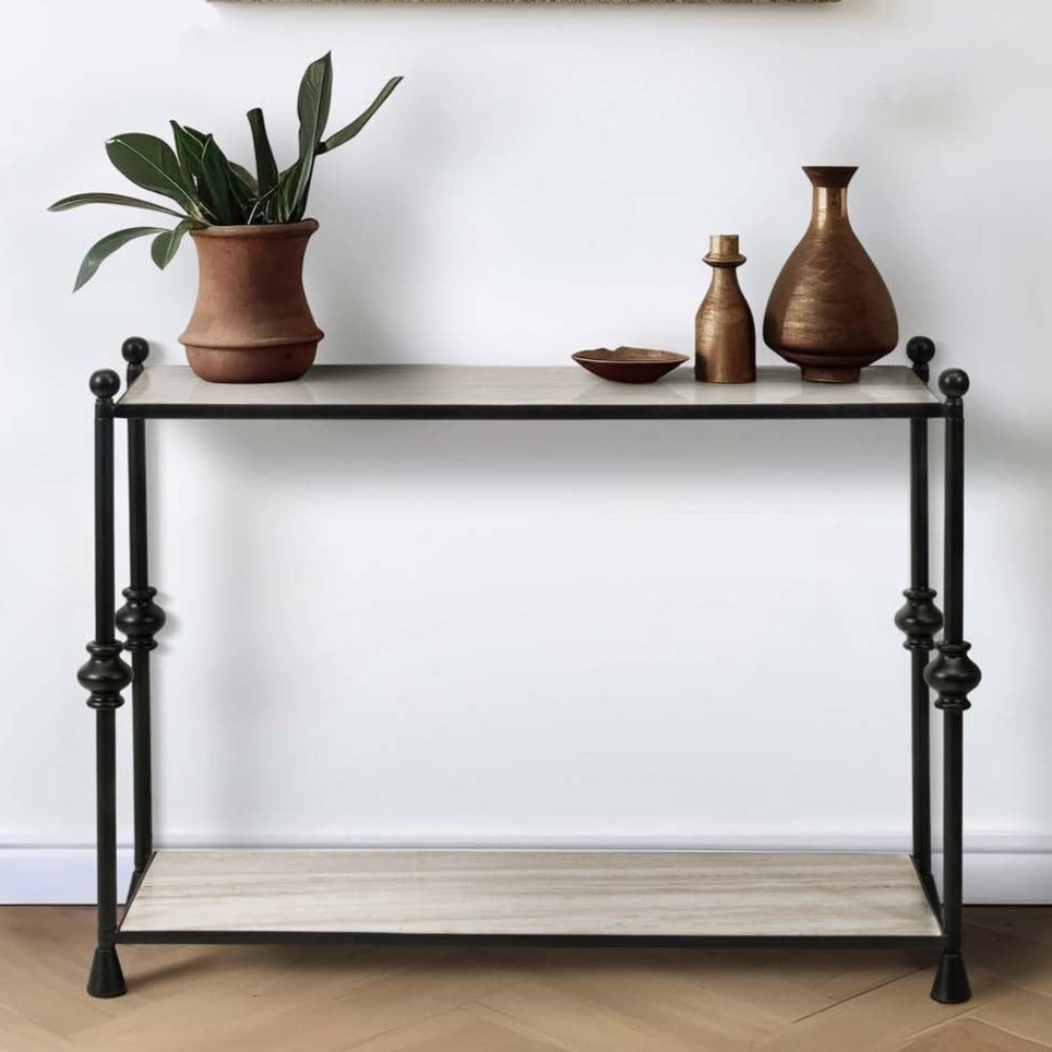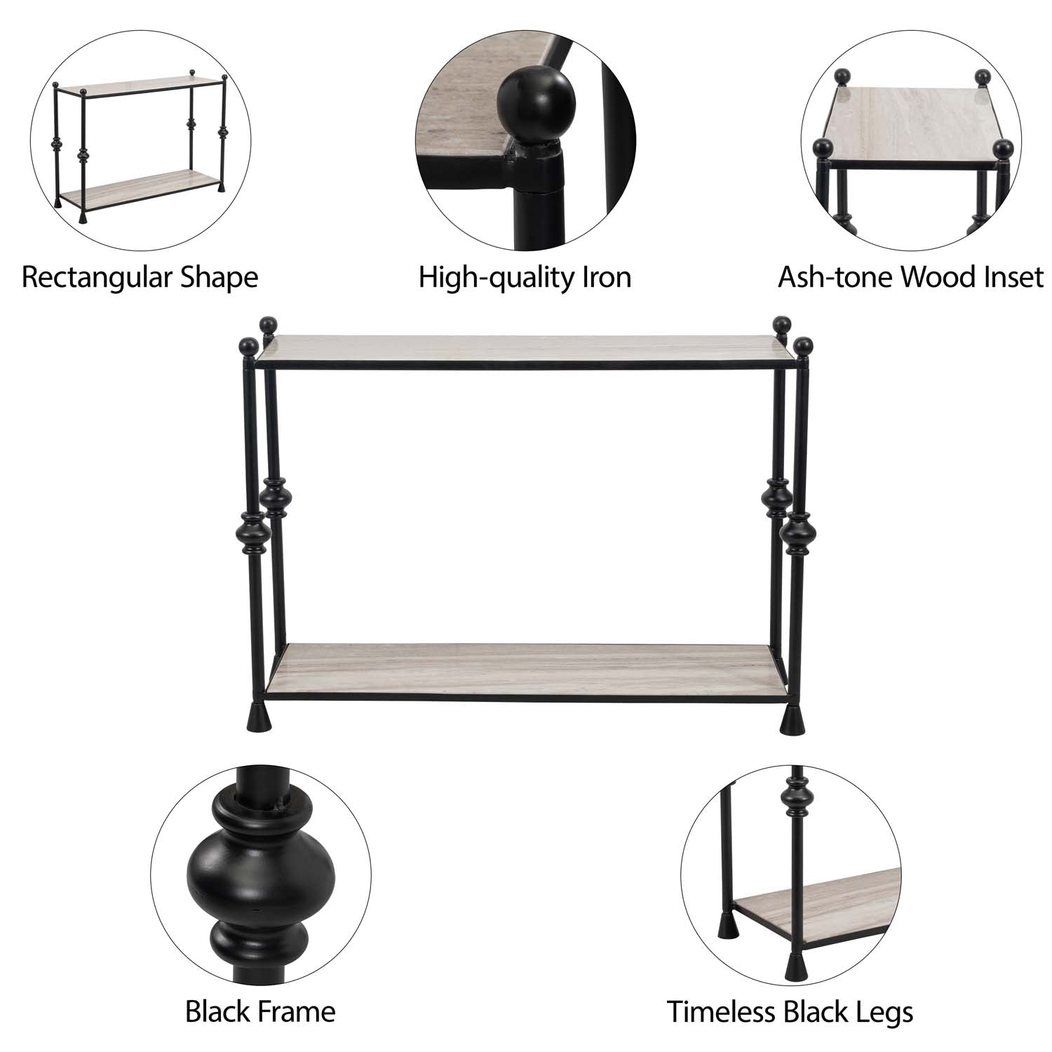 Transform your home into a haven of sophistication with Blu from Sabavi Home's Elliot Black Console Table. Meticulously crafted, this console embodies elegance with its dual-shelf arrangement and juxtaposition of distressed cream and bold black. Measuring 44 inches in length and 31 inches in height, it boasts the perfect size for showcasing decorative pieces or organizing daily items. Durable materials ensure this piece is not just visually appealing but also a lasting addition to any decor.