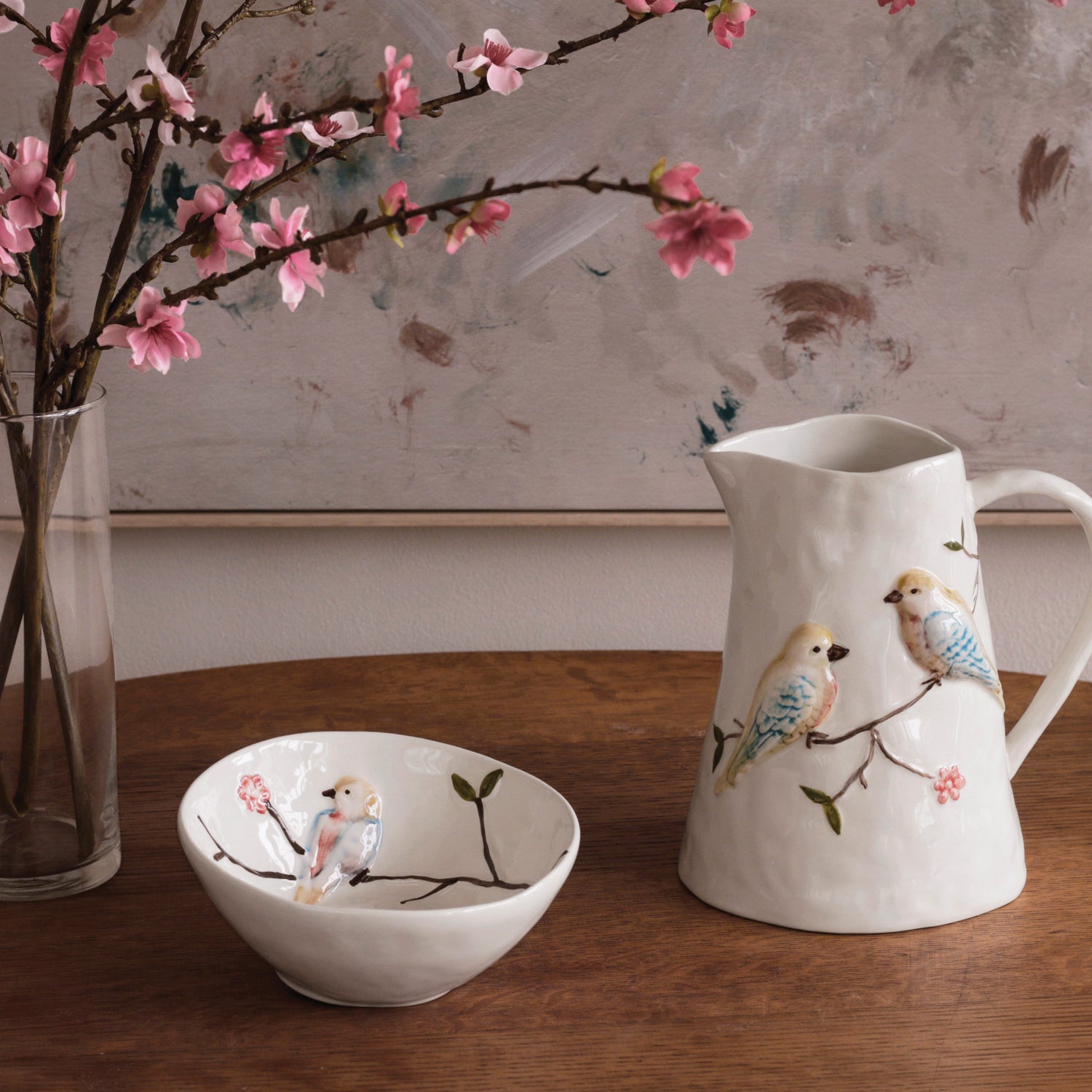 - Design: Hand-painted with charming songbirds perched on flowering branches