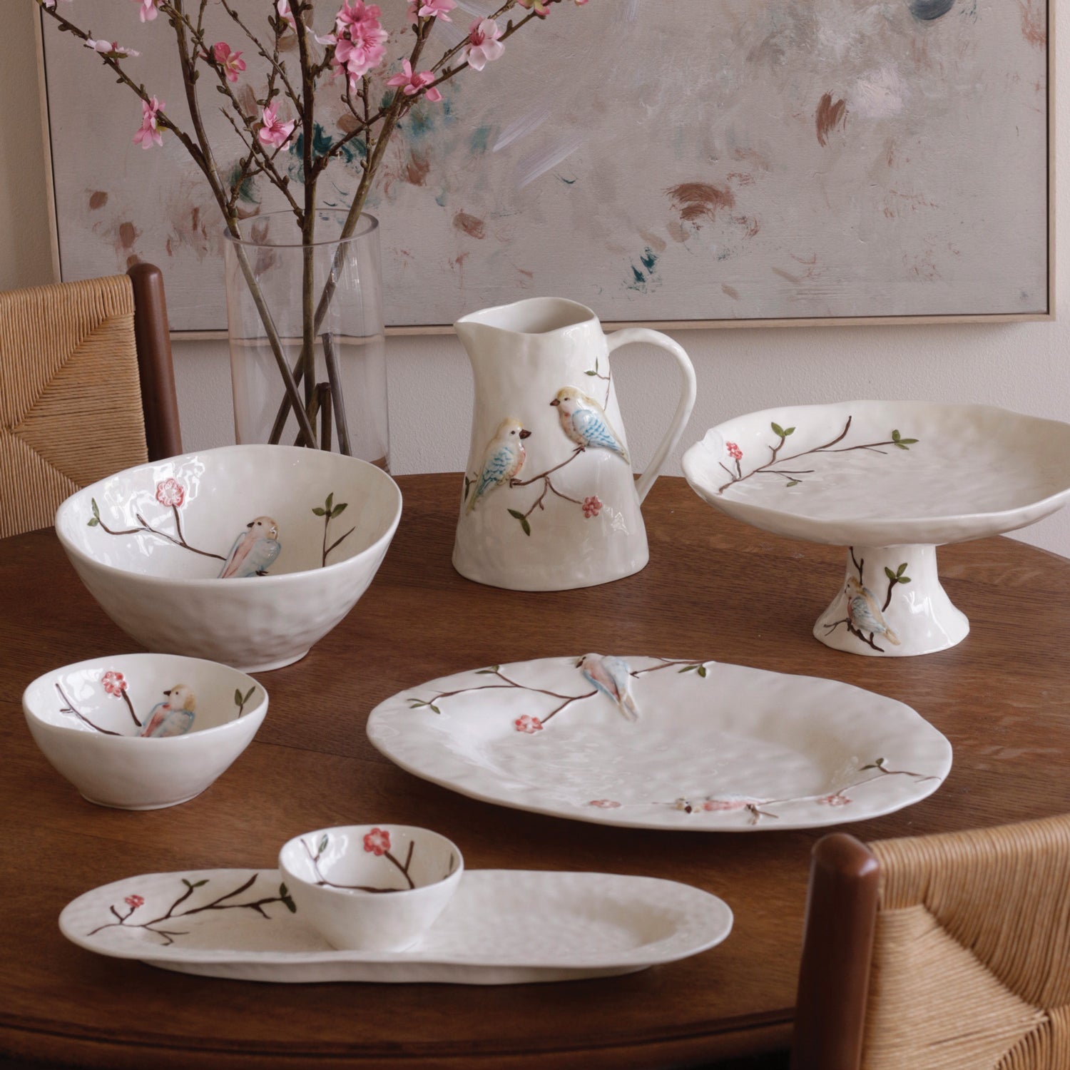 Nature inspo is on-trend with the Ceramic Bird on Branch small bowl set. Handcrafted in Portugal, this set of two bowls features a charming songbird motif perched on flowering branches. Perfectly sized for serving salads, desserts, chips, or nuts, these bowls bring a touch of spring and summer to your table. With their unique, hand-painted design, no two pieces are alike. Hand wash only.