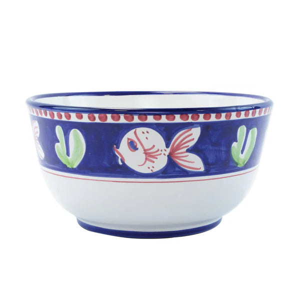 The colorful blue and red Campagna Pesce Deep Serving Bowl features whimsical handpainted fish gracefully swimming among lush green algae. Made from durable terra cotta, this bowl is perfect for serving generous portions of salads, pasta, or side dishes, adding a vibrant marine touch to your dining experience. Its playful design makes it a charming centerpiece for any table setting.