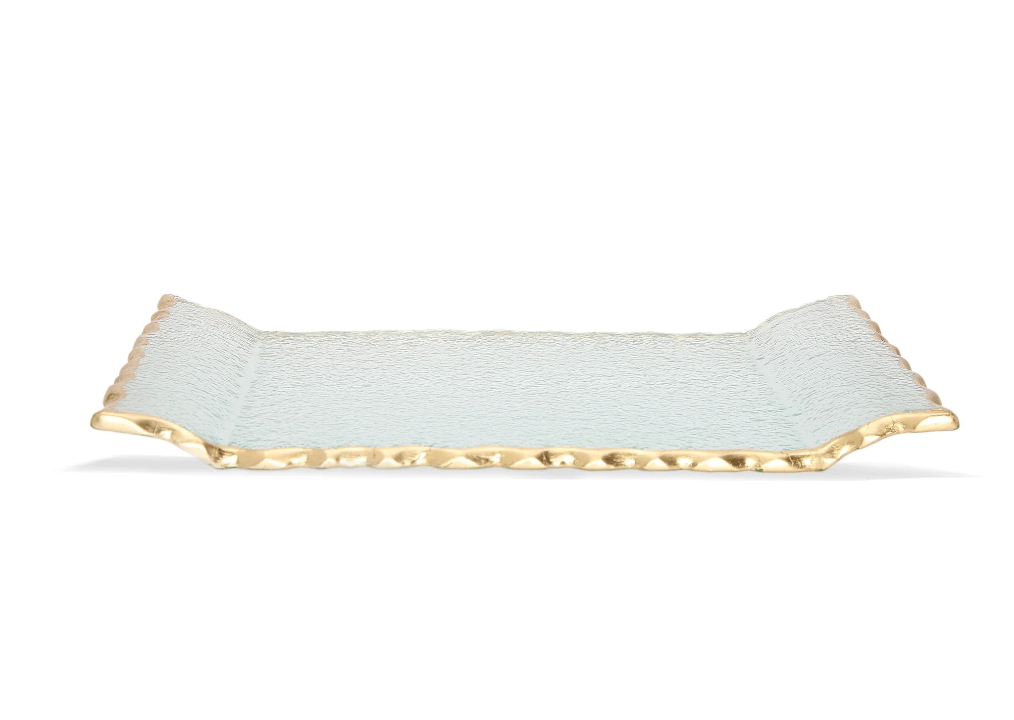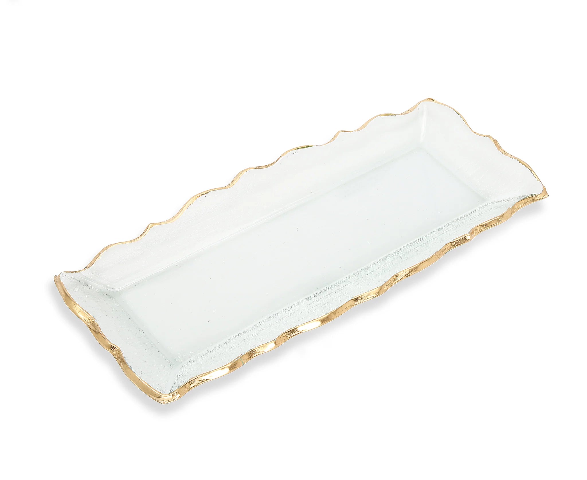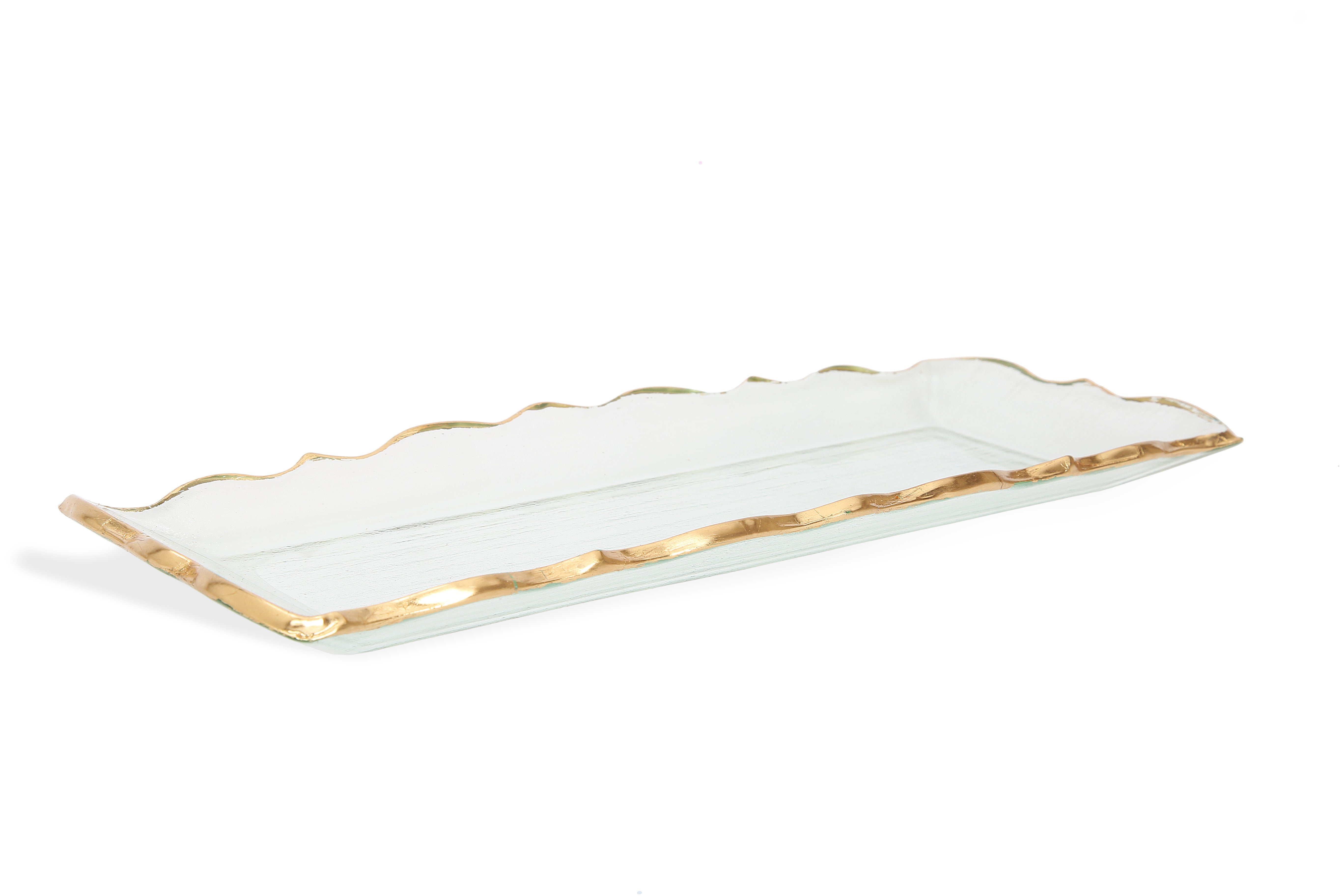 Enhance any dining occasion with this Classic Touch Glass Oblong Tray with Gold Edge, beautifully accented by a glossy gold rim for a touch of sophistication. Perfect for serving desserts, confections, or small bites, it brings refined charm and versatility to both everyday meals and special gatherings.