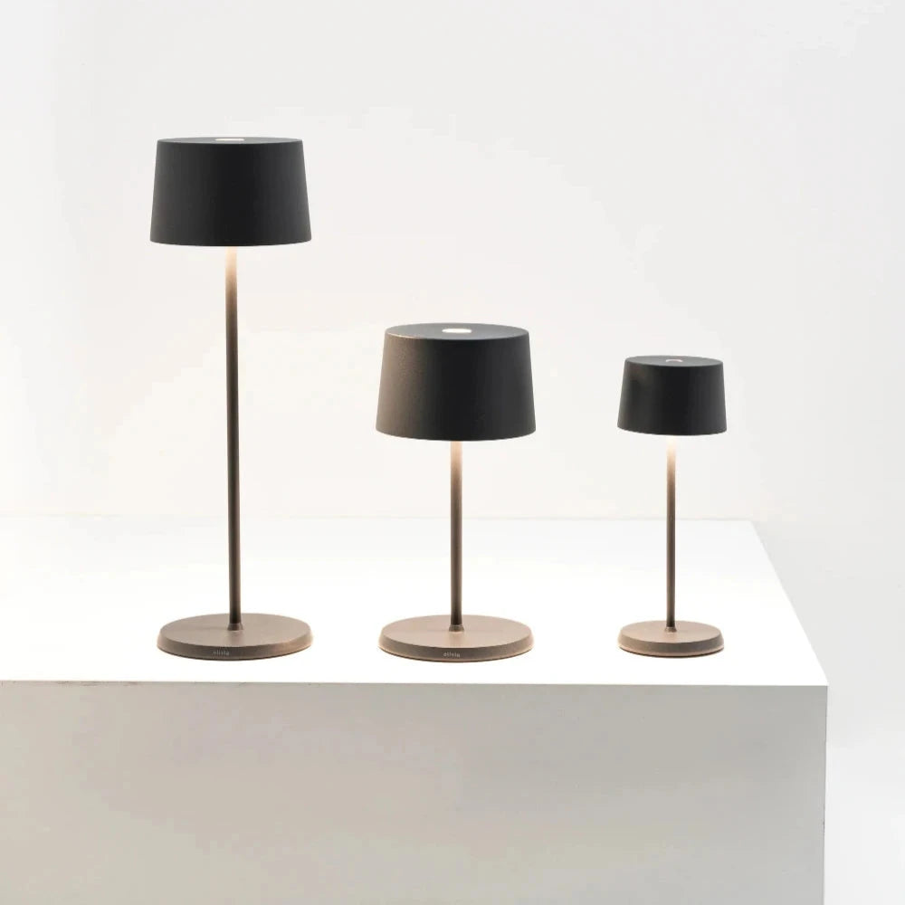 The Zafferano Olivia Pro Cordless Rechargeable Micro Table Lamp is a rechargeable, battery-powered cordless table lamp designed for versatility and convenience. Featuring touch controls for on/off operation, dimming, and color temperature selection, this lamp is equipped with a dimmer memory function that restores the last brightness setting upon activation. Its compact design makes it an ideal addition to any space, providing adaptable lighting tailored to individual needs.