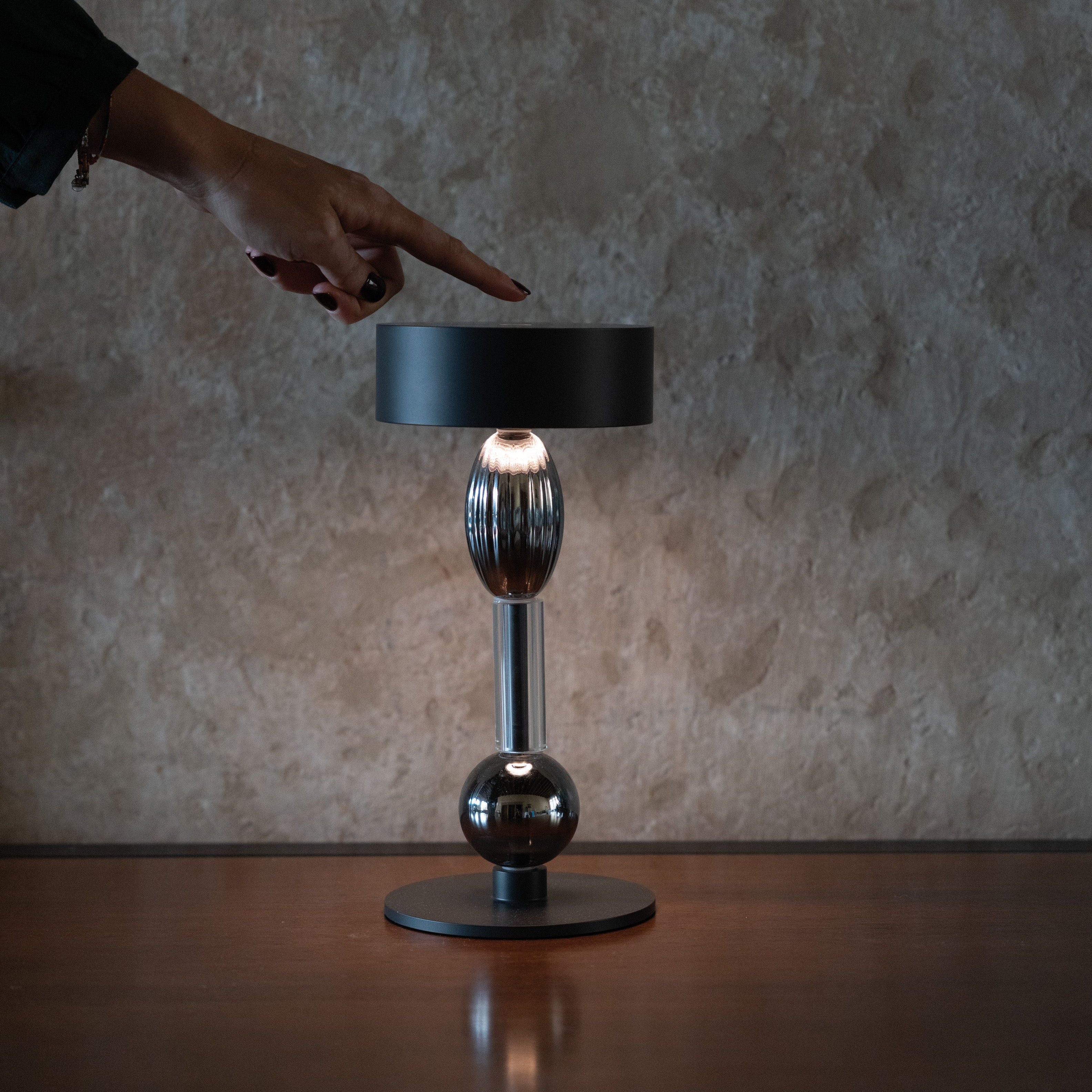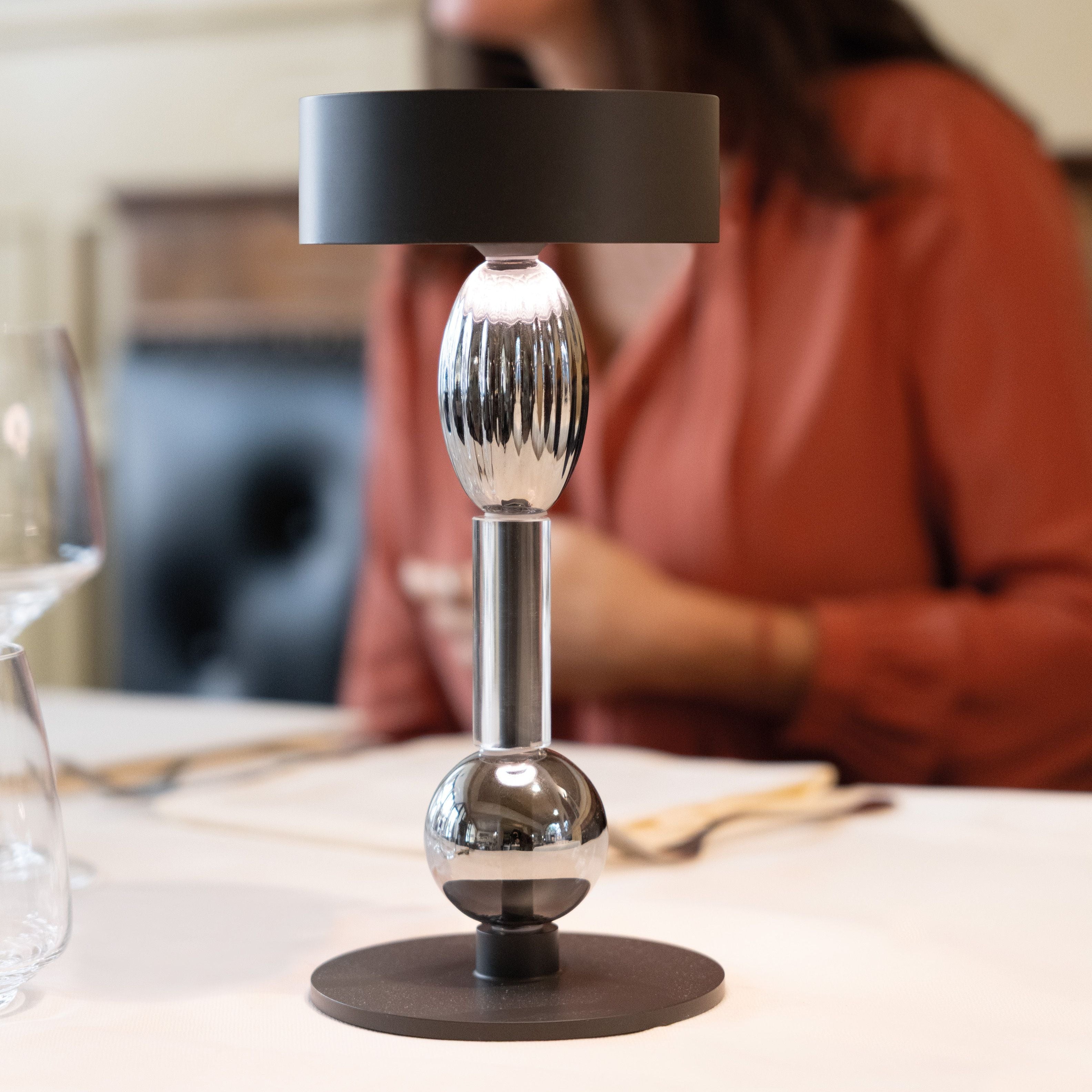 The Zafferano Royal Family Wi-Fi Cordless Table Lamp combines modern innovation with timeless elegance. Designed by Lucchesedesign, it features a painted aluminum frame with hand-blown borosilicate glass and a prismatic diffuser that casts a warm, atmospheric glow. Touch control and Wi-Fi connectivity allow effortless adjustment, with four color temperature options and dimmable light to suit any mood. Powered by a rechargeable lithium battery, it offers up to 36 hours of illumination and recharges on its included contact base in about five hours.