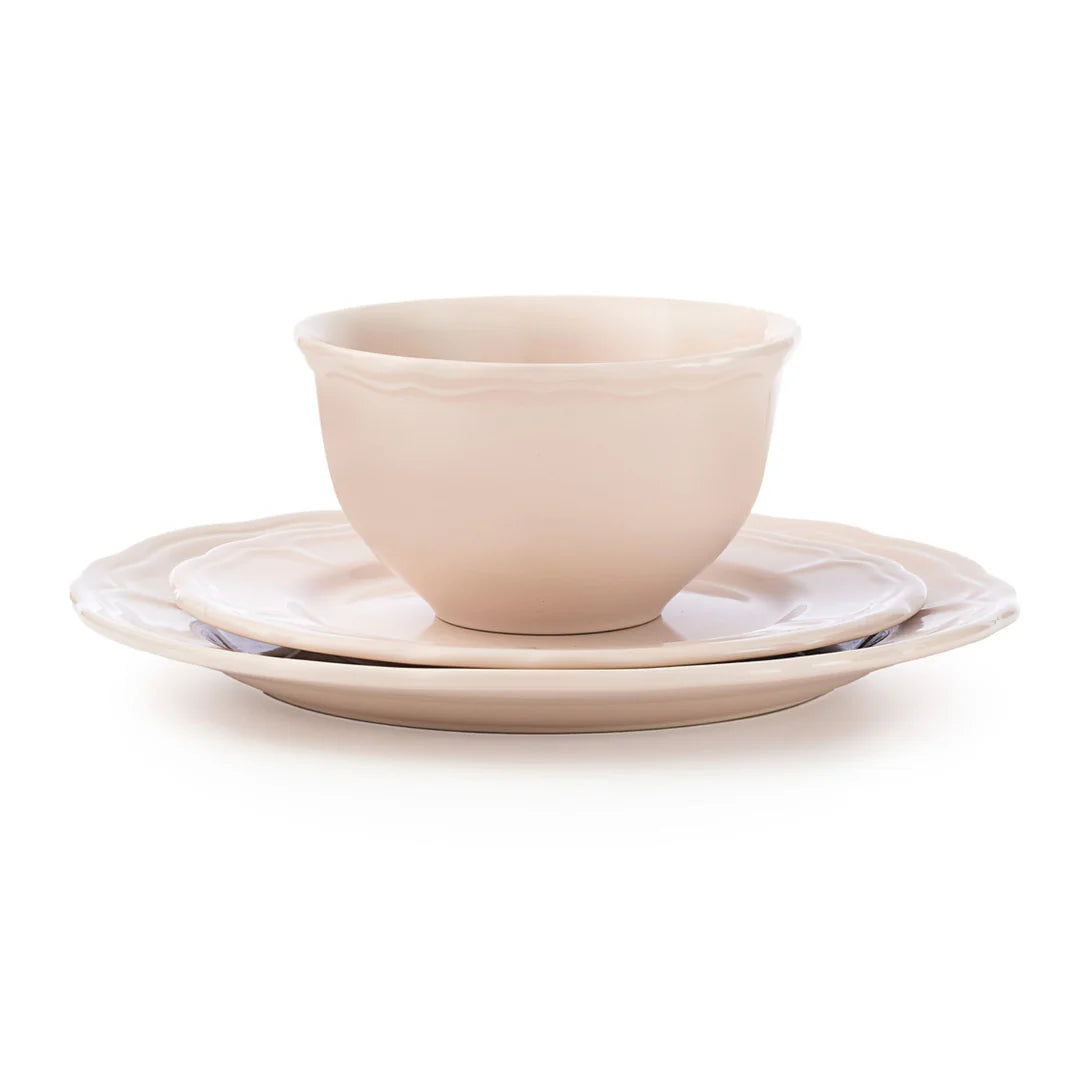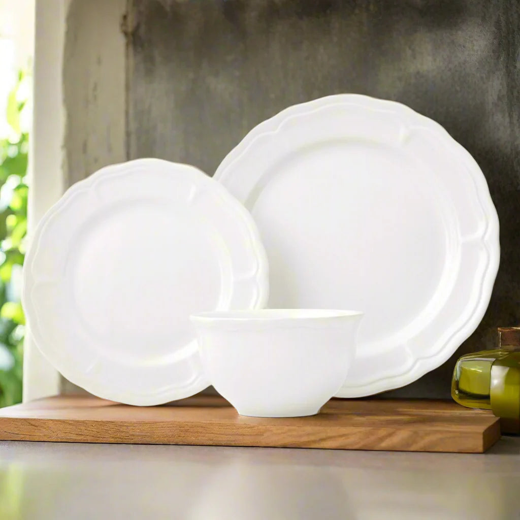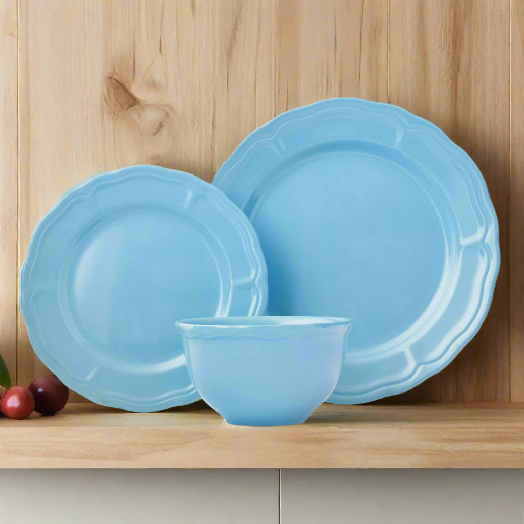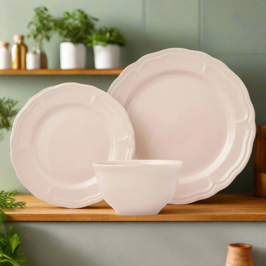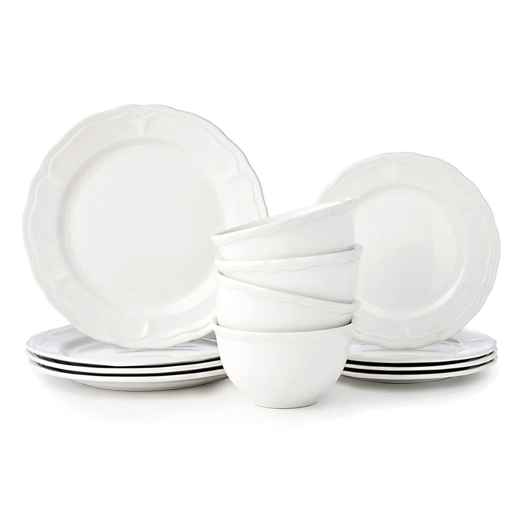 The Madison Stoneware 12-Piece Dinnerware Set brings effortless charm and timeless appeal to every table. Crafted from durable stoneware with gently scalloped edges, each piece embodies classic elegance for both casual meals and special gatherings. Available in white, blue, and blush, it complements any décor with its refined farmhouse aesthetic.