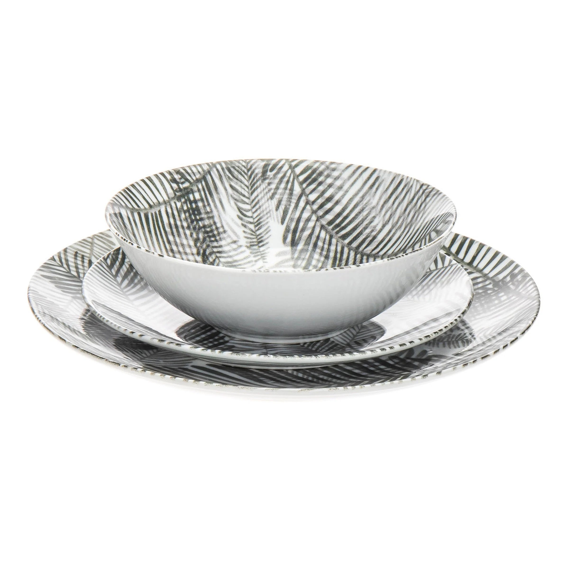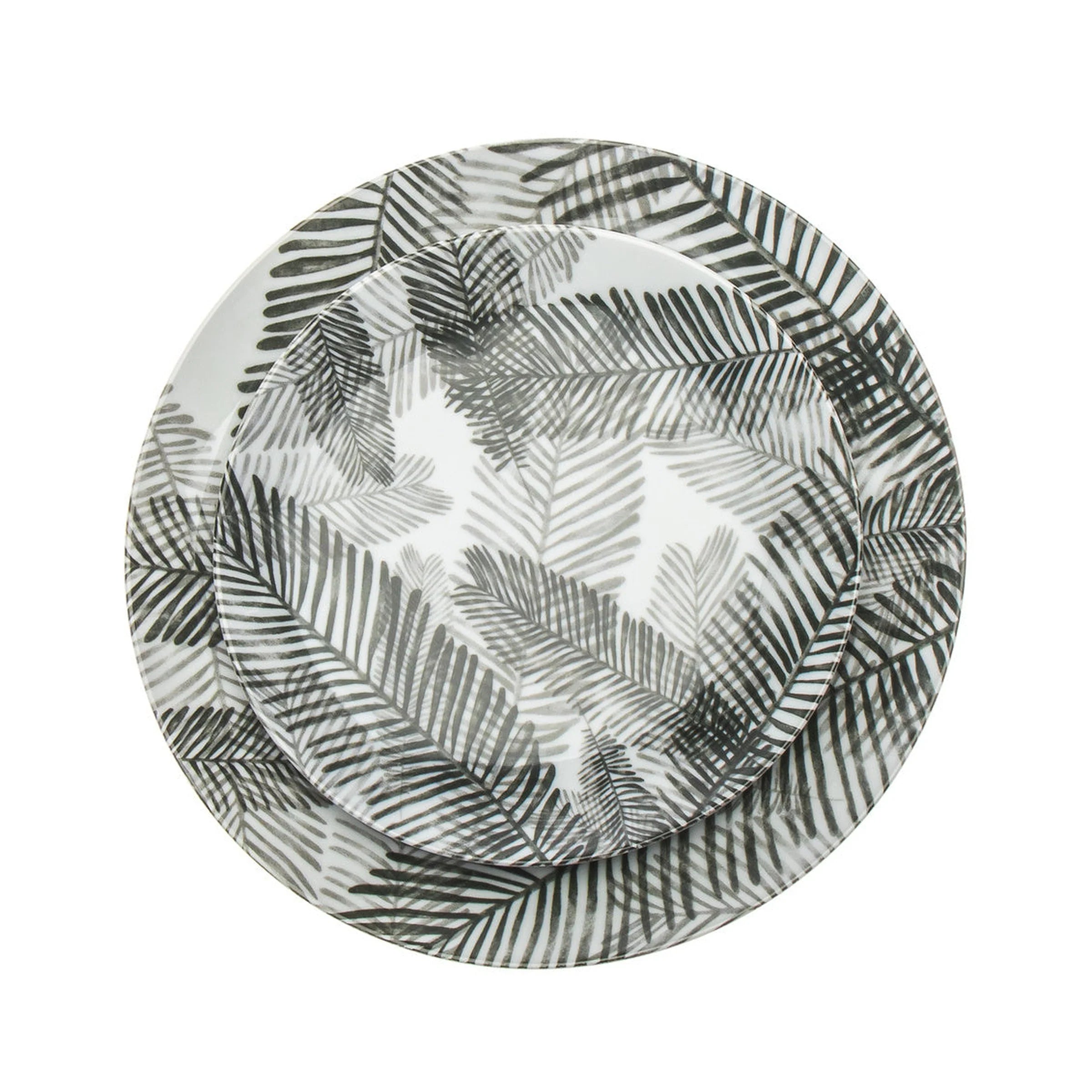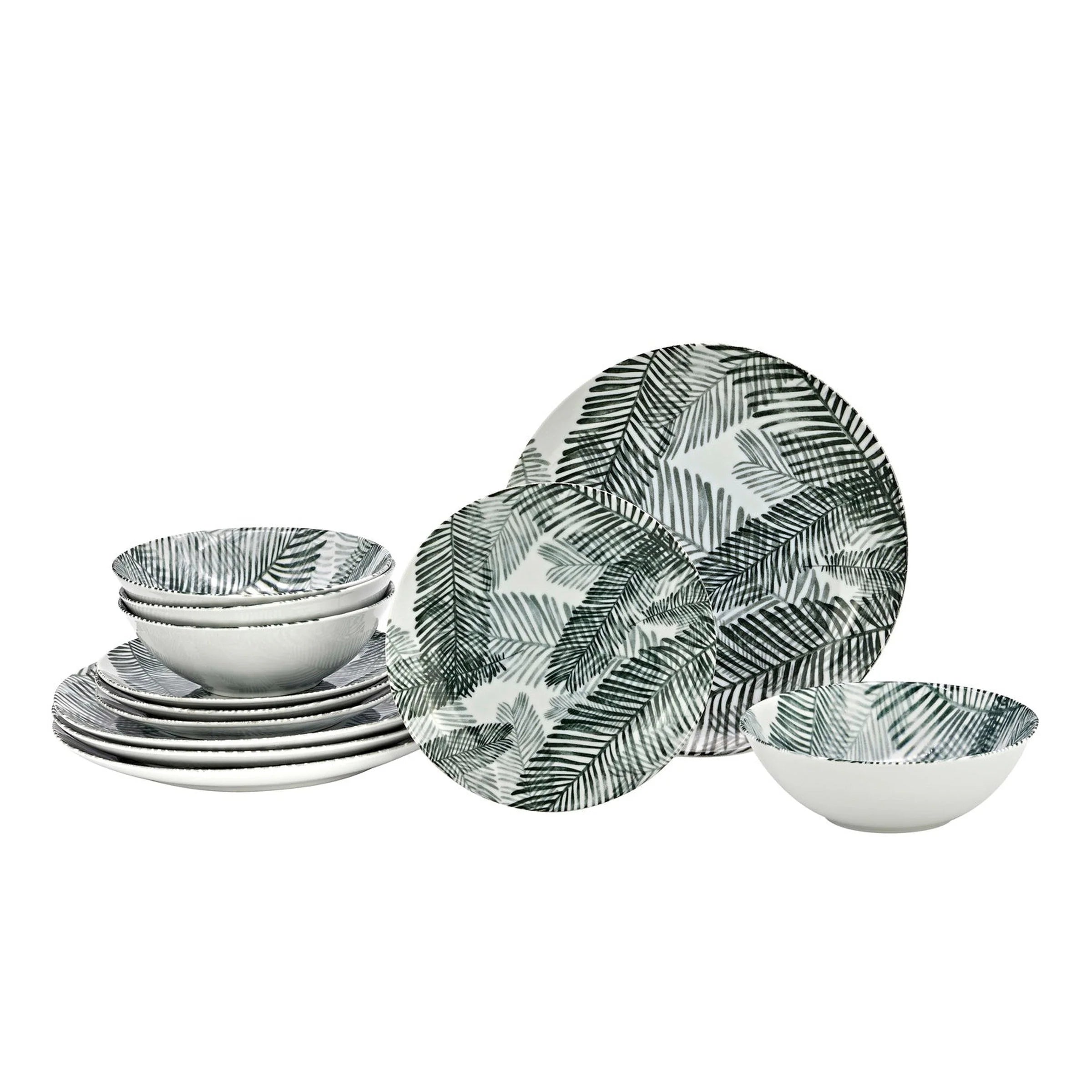 Infused with a graceful palm frond motif, this Godinger Felice Porcelain 12-Piece Dinnerware Set creates a relaxed yet elevated table setting, blending effortless charm with lasting durability.