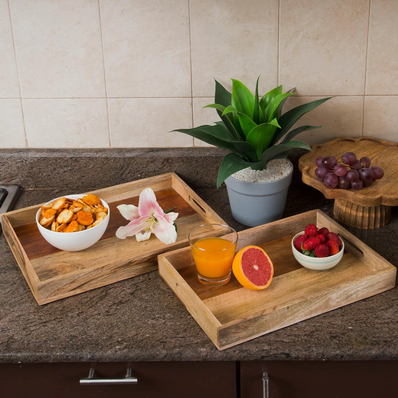 The Mela Artisans Rustic Elegance Two-Tone Serving Tray, Set of 2 is beautifully handcrafted from natural wood, showcasing a harmonious blend of light and rich tones for a rustic yet refined appeal.