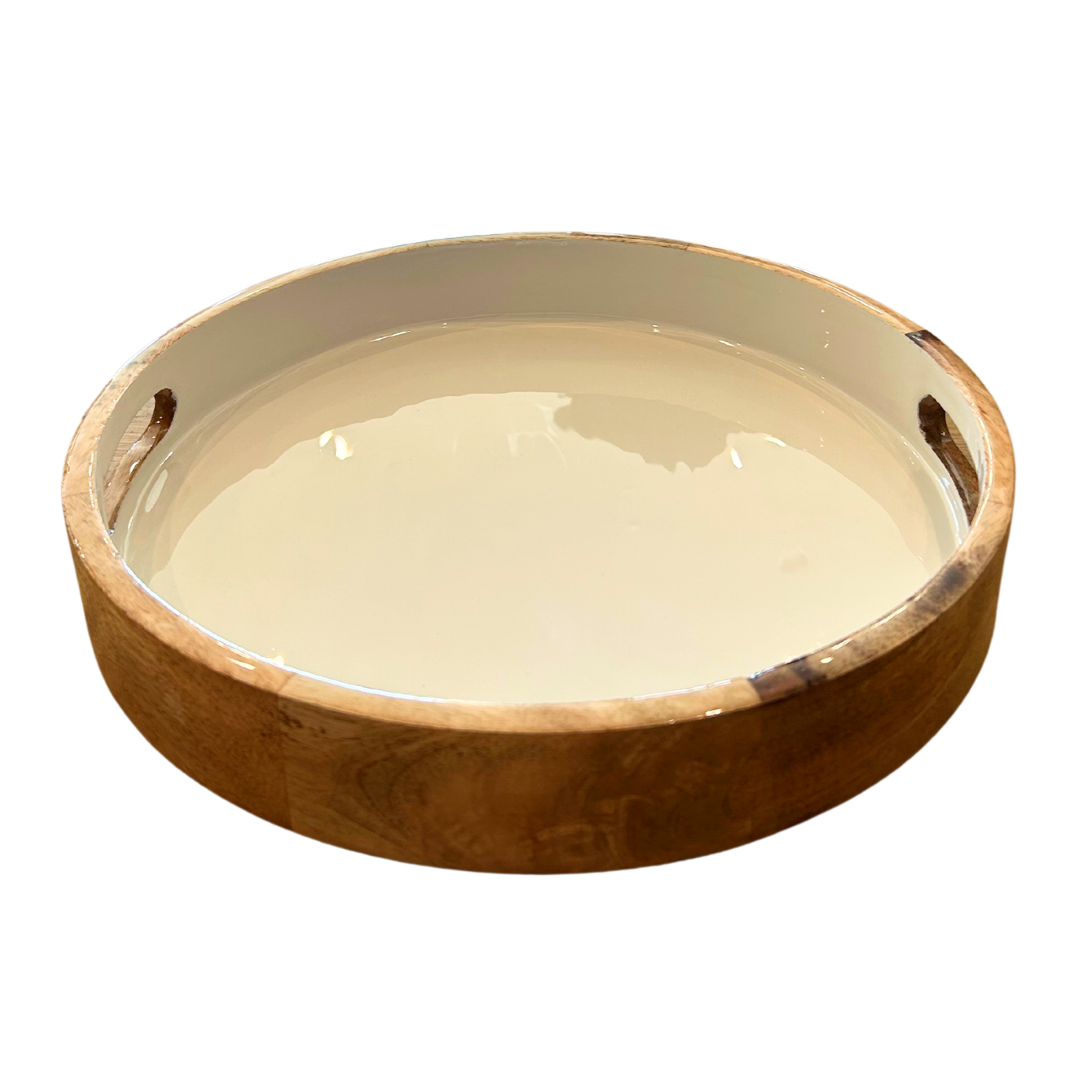 Crafted from natural mango wood and finished with a luminous white enamel, this Indy Home Mango Wood & Enamel Round Tray brings both warmth and refinement to the table. Its smooth surface and gentle curves create an inviting backdrop for serving, while the handmade quality ensures carries its own unique grain and character.