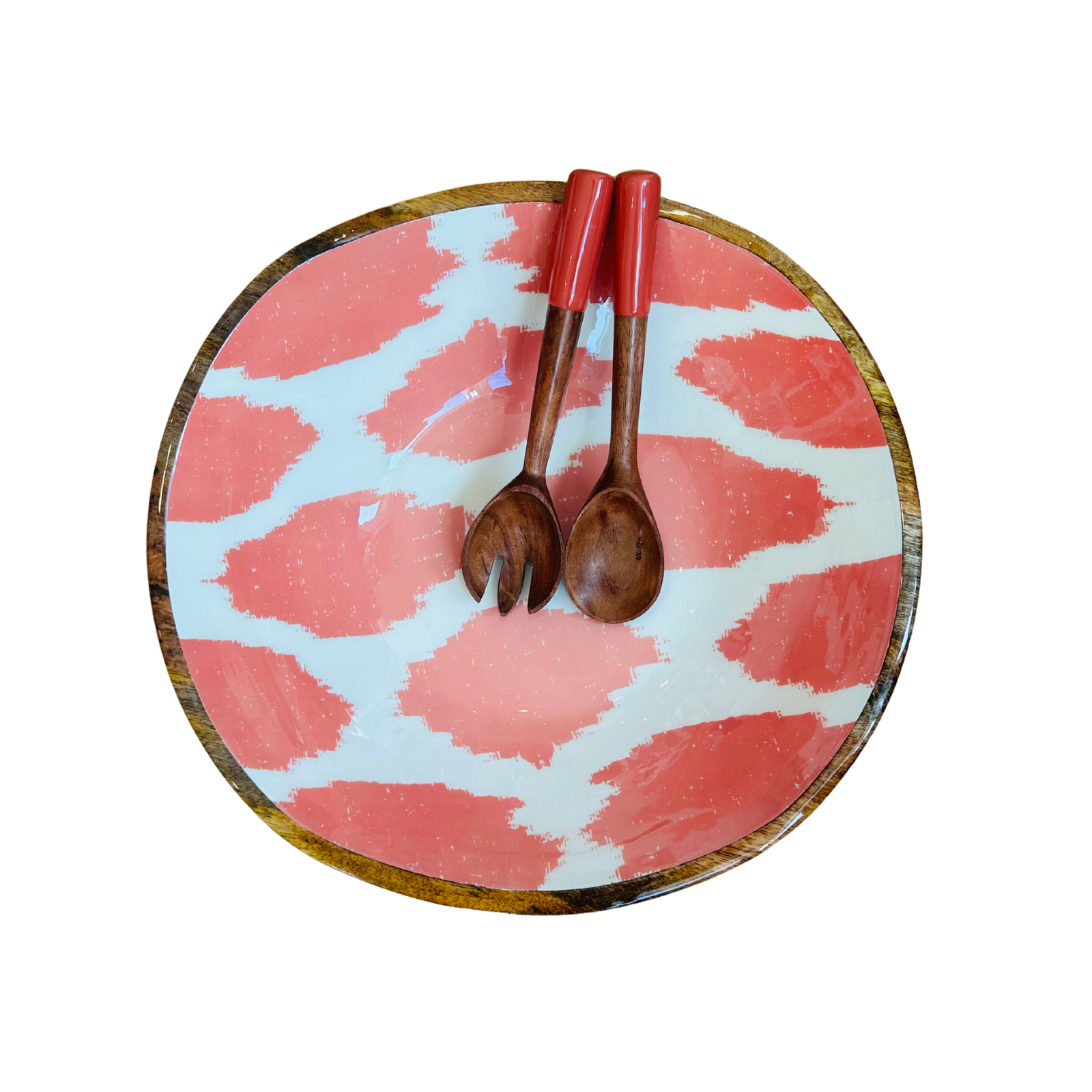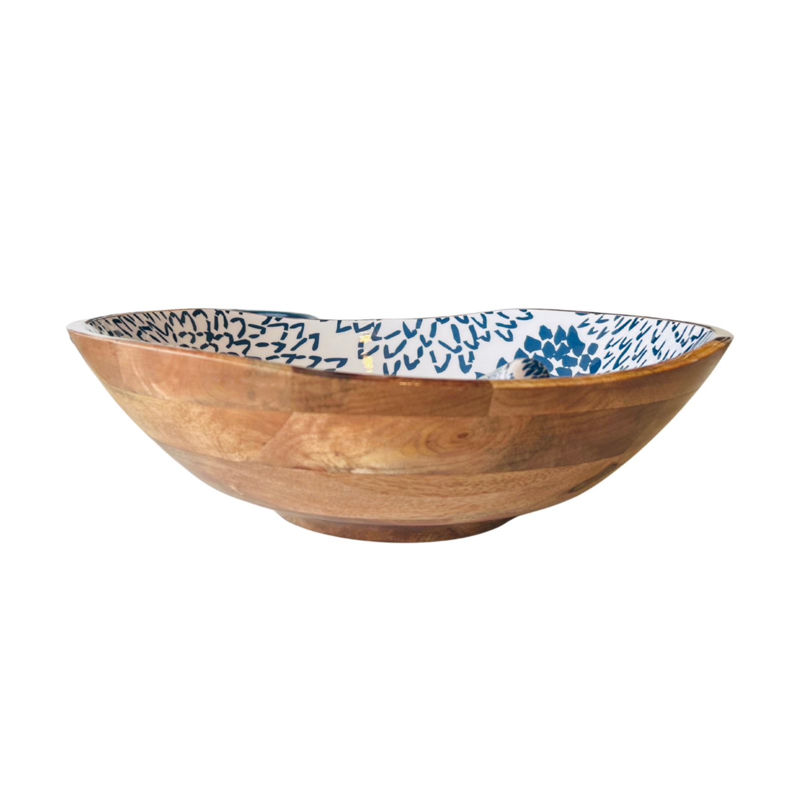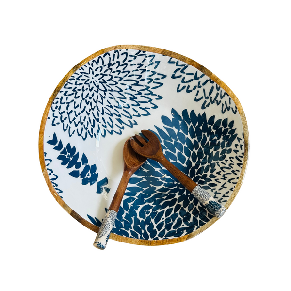 The Indy Home Large Montauk Salad Bowl with Servers brings warmth and artistry to the table with its smooth enamel interior and rich natural grain. Available in floral navy and white, graphic sienna and cream, taupe, or white, each piece adds a refined touch to everyday dining and special gatherings.