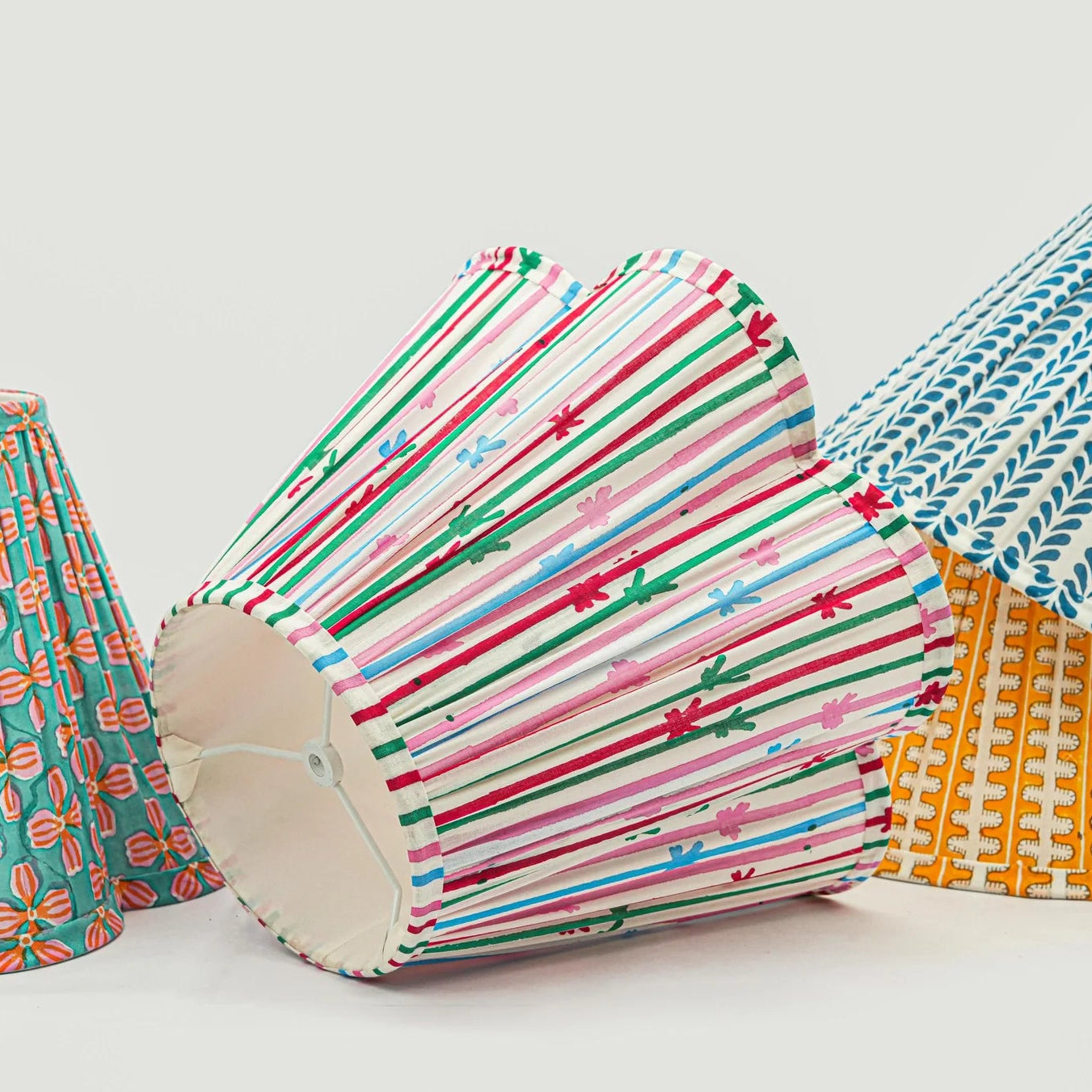 Say hello to happy with this Mela Artisans Bellebow Handblocked Lampshade, bursting with personality in playful pink, green, red, and blue stripes that dance across soft white cotton. Designed to brighten kids’ rooms, cozy corners, or reading nooks, it adds a joyful pop of color to any space.