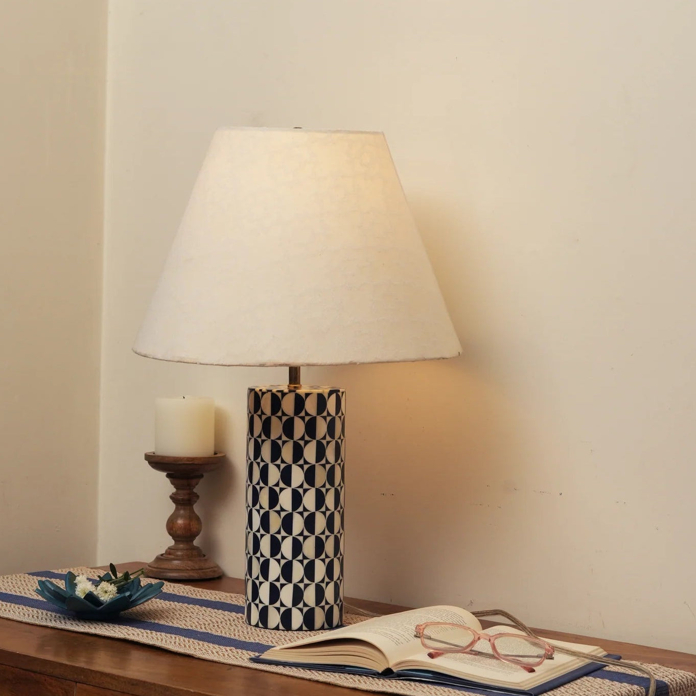 Crafted from bone and resin, the Mela Artisans Geo Inlay Blue Table Lamp features a striking geometric pattern in vivid blue and white. Its bold design and handcrafted detailing bring artistic flair and sophistication to any room.