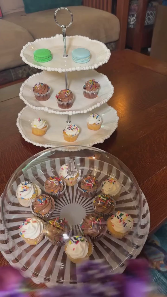 - Design: three graduated serving areas with charming pearl rims, silver-toned metal risers, and a circular handle