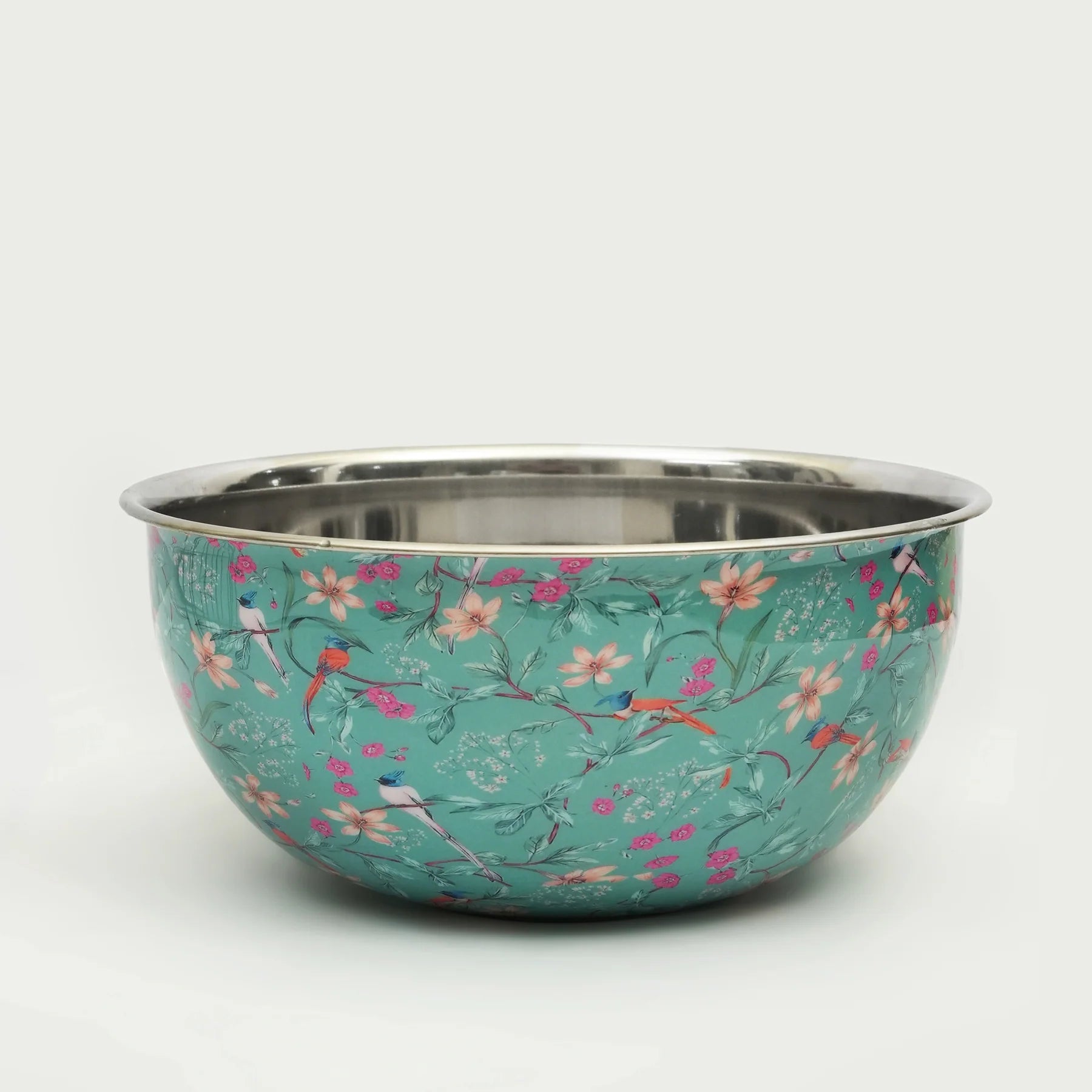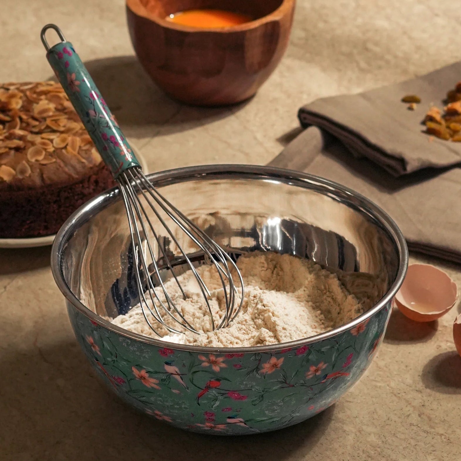 Infuse your kitchen with the vibrant charm of the Mela Artisans Aqua Flora Bowl and Whisk Set. Featuring a botanical enamel design in refreshing aqua, green, and multicolor tones, the stainless steel bowl brings artistic flair to everyday prep. Paired with a sleek whisk, it’s perfect for mixing, serving, or displaying as a decorative accent.