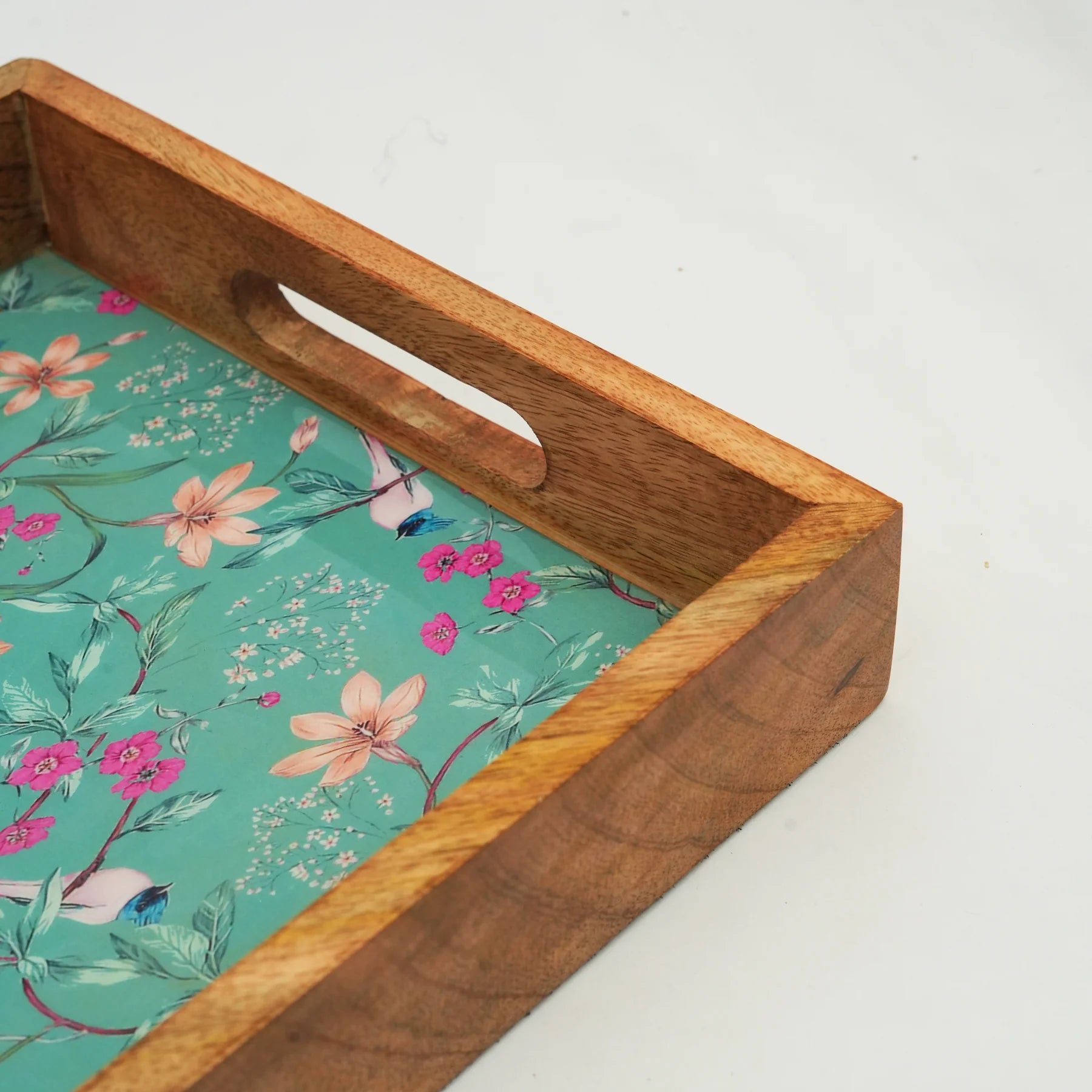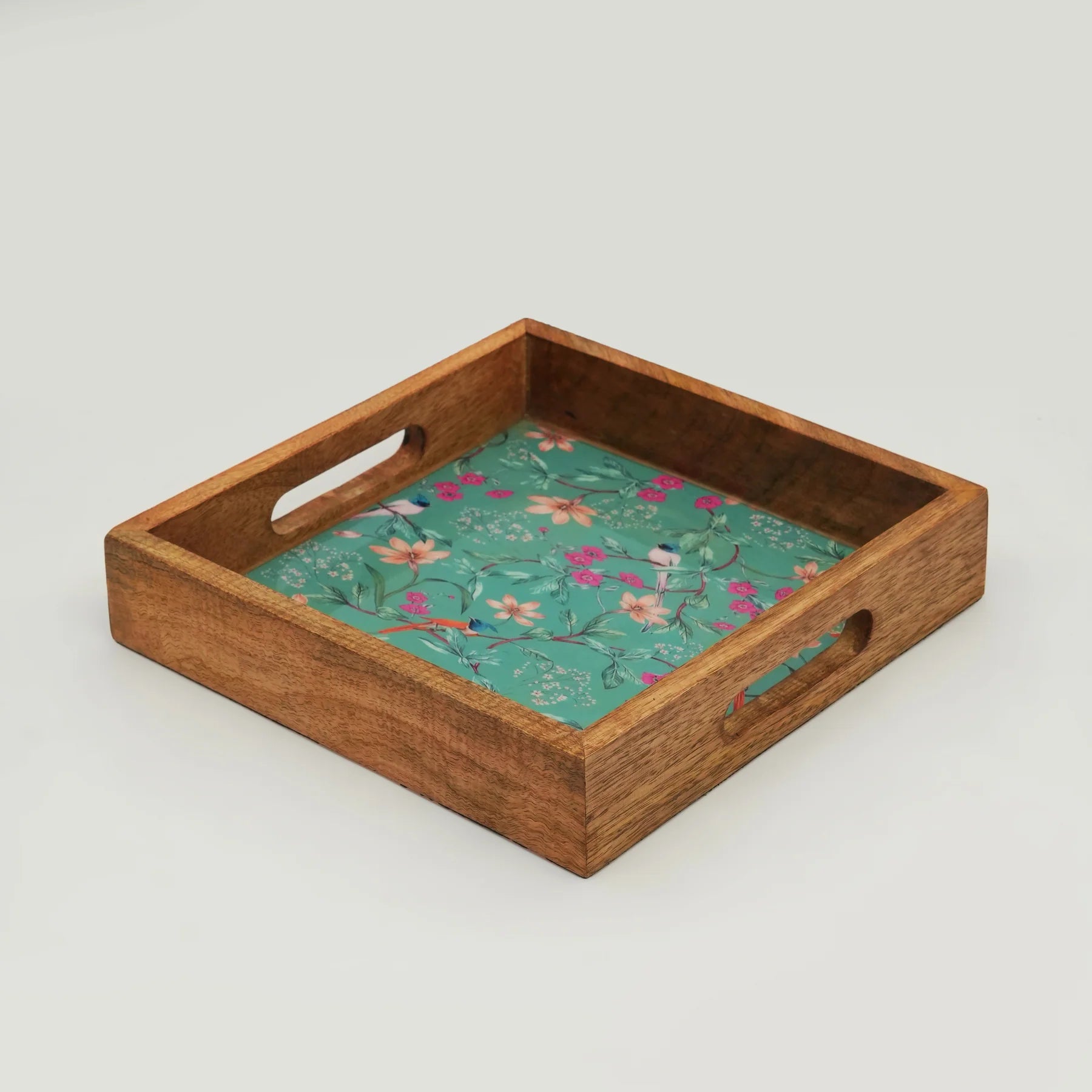 Let nature’s charm grace your home with the Mela Artisans Aqua Flora Inlay Tray. Featuring a serene aqua enamel base accented with delicate florals and perched songbirds, it captures the peaceful essence of the outdoors. Handcrafted from warm mango wood, this 10-inch square tray is ideal for serving, organizing, or displaying décor with effortless style.