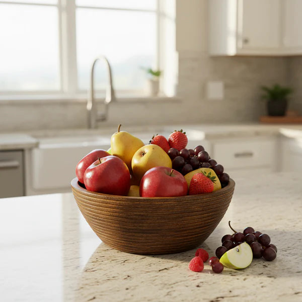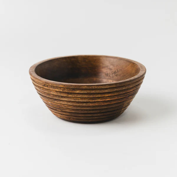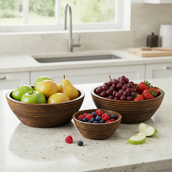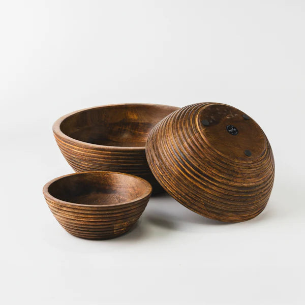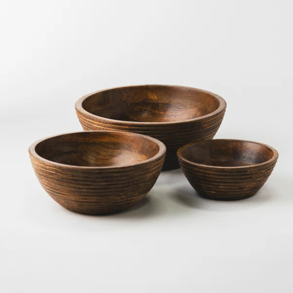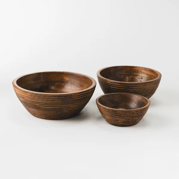 Handcrafted from rich, sustainably sourced mango wood, this Mela Artisans Cascade Handcarved Mangowood Nested Bowl Set of 3 celebrates the beauty of natural grain and texture. A ridged exterior adds sculptural interest, while the smooth interior reflects refined artisan craftsmanship, bringing warmth and organic elegance to the table.