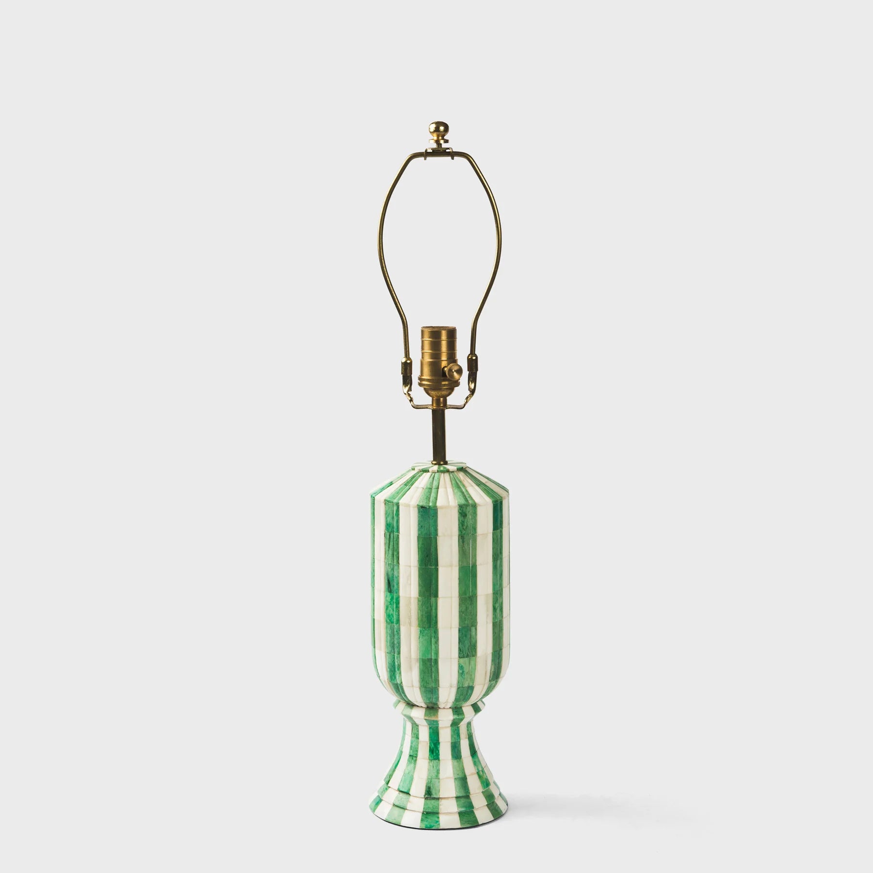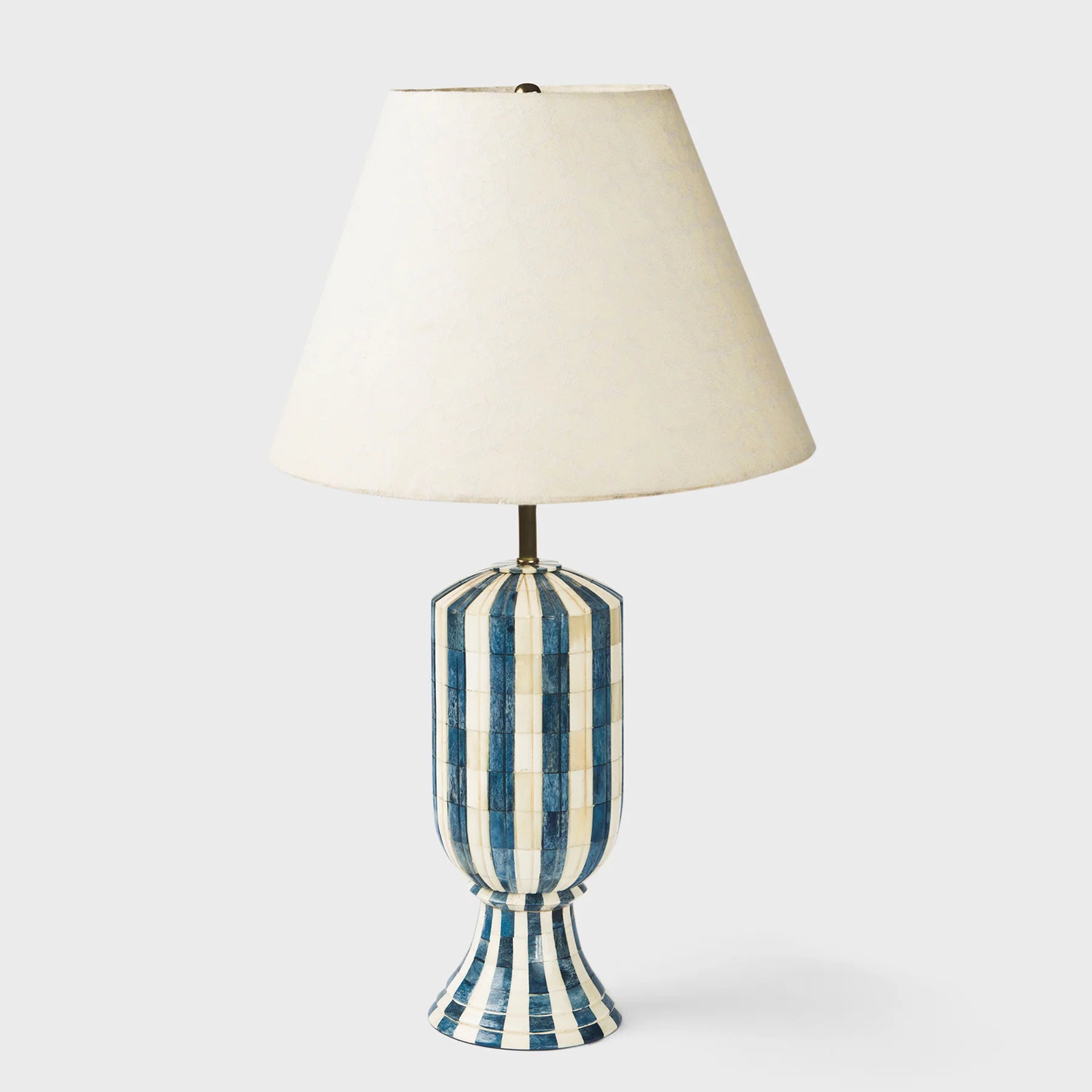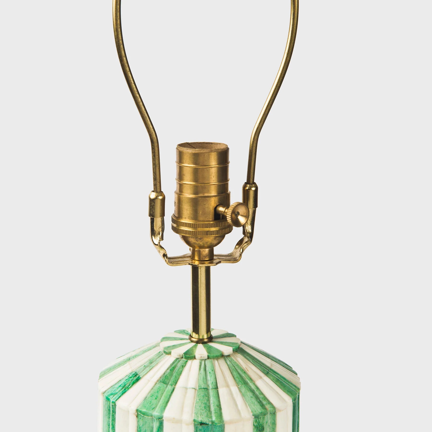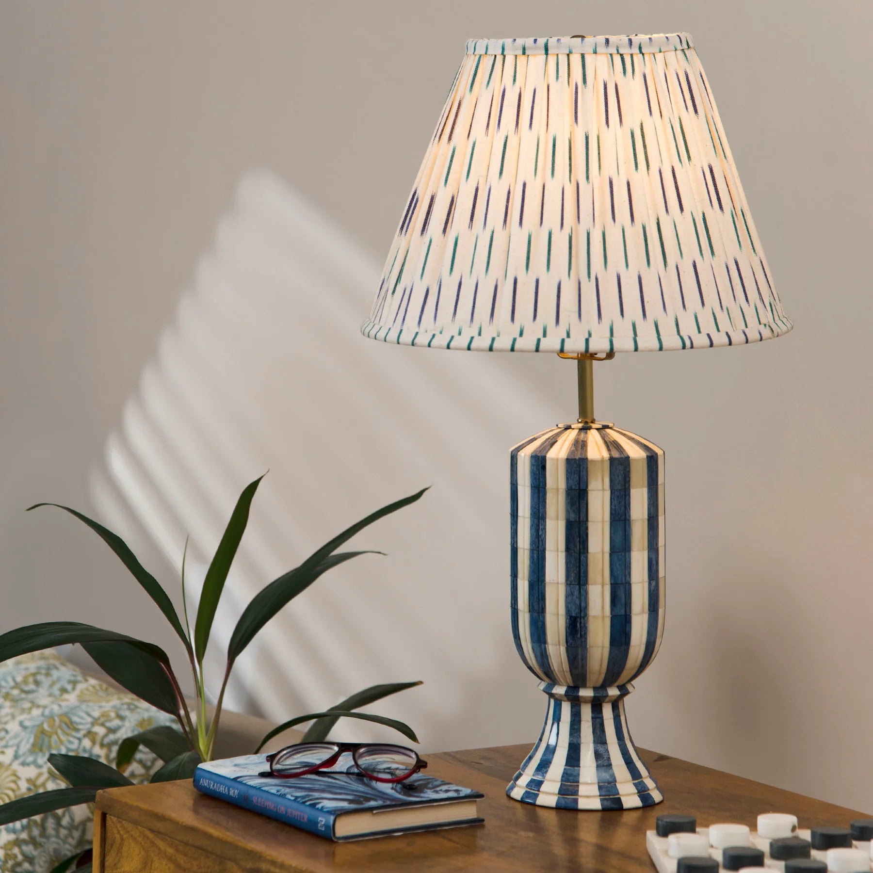 Sleek stripes meet timeless craftsmanship in this Mela Artisans Eterna Bone Inlay Lamp, meticulously handcrafted by skilled artisans. The clean linear pattern is paired with rich hues emerald green for a fresh, sophisticated touch or midnight blue for a bold, modern presence creating a striking balance of form and function.