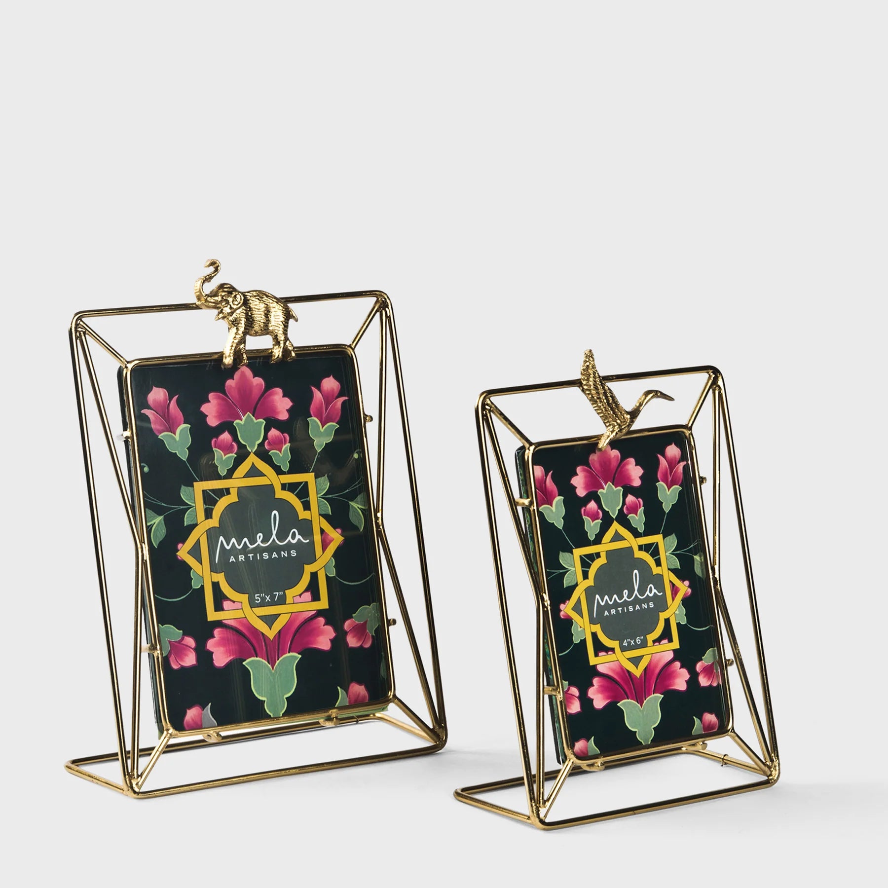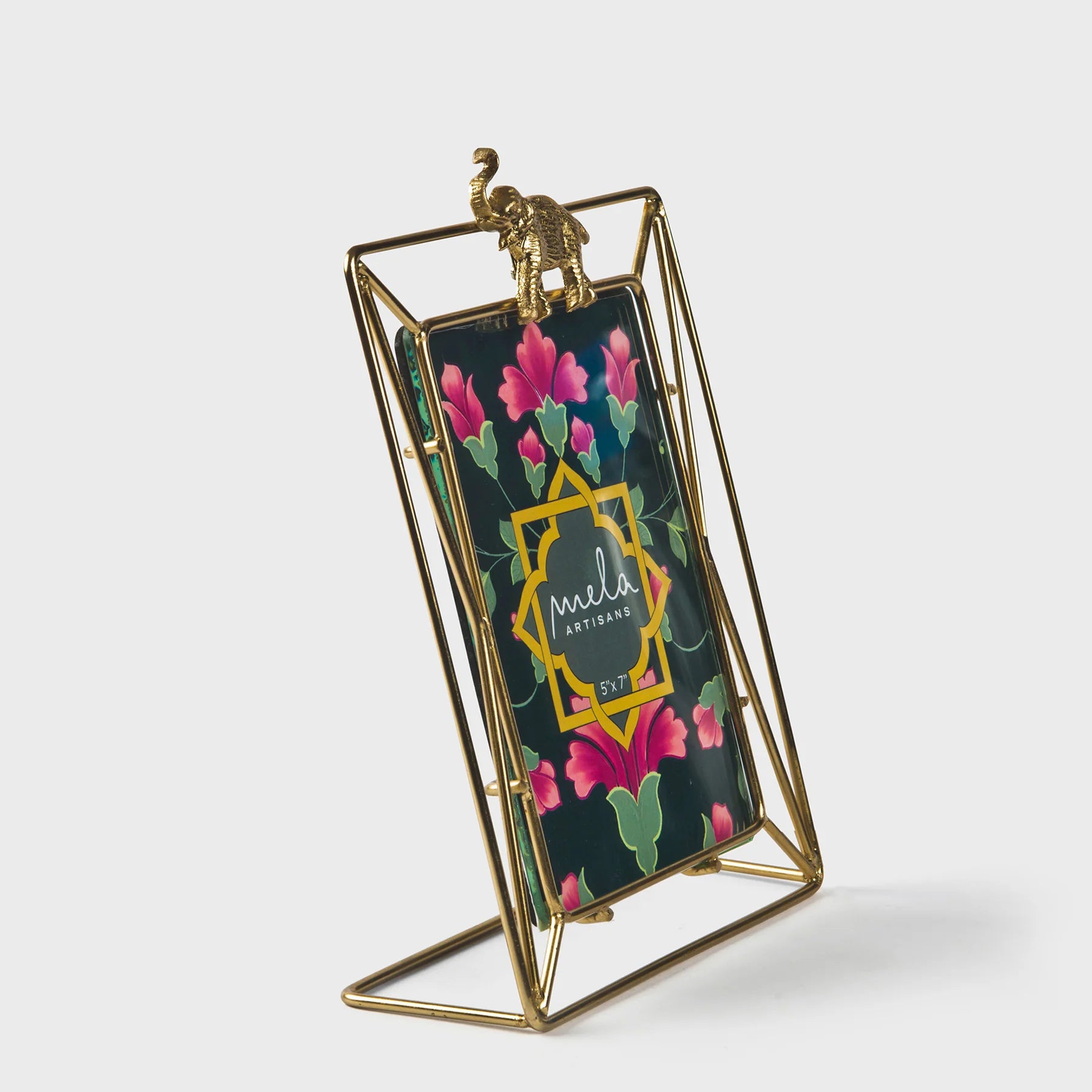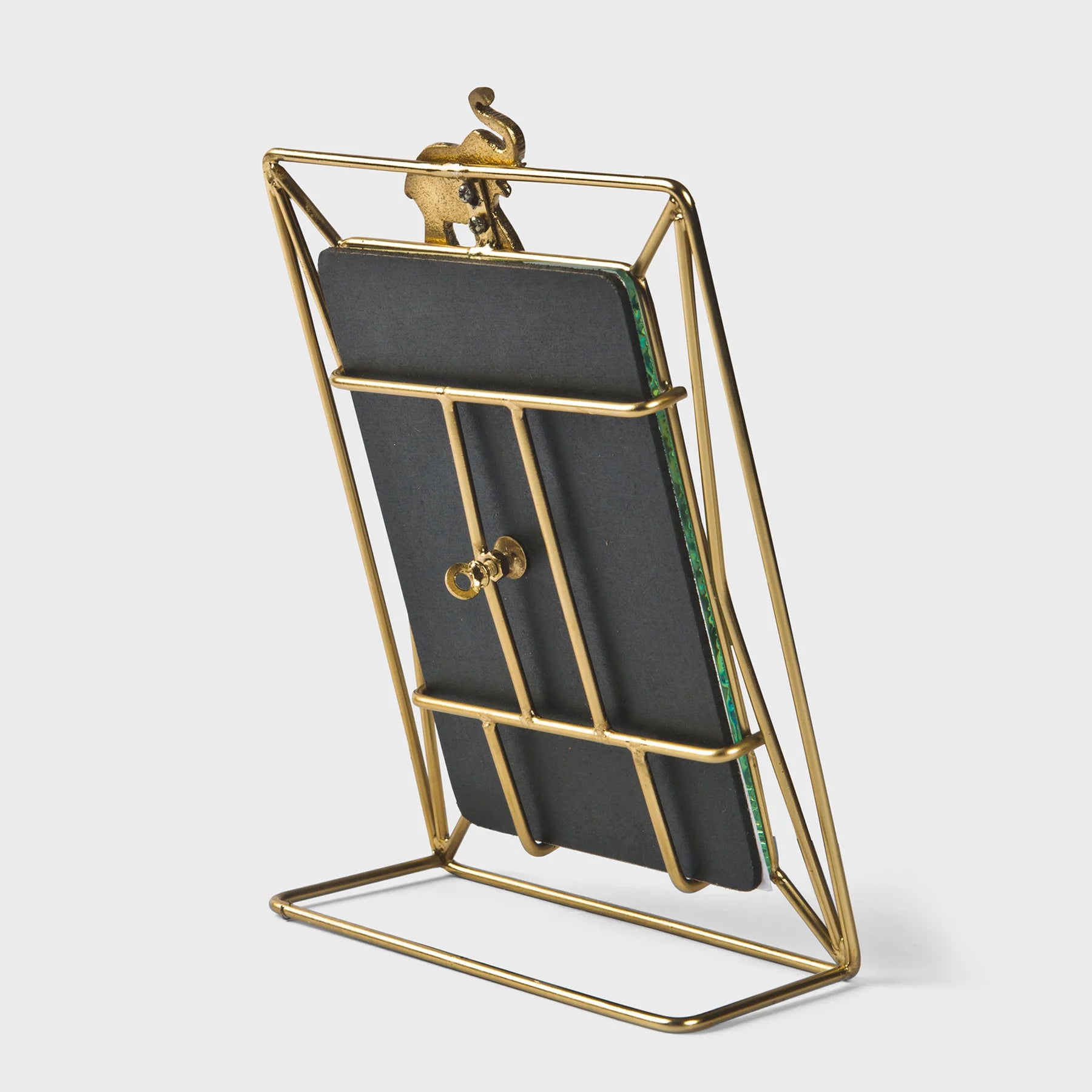 Grace the tabletop with this Mela Artisans Gilded Elephant Frame, beautifully accented with a sculptural elephant motif. The geometric open-frame design is finished in a luxe antique gold tone, adding warmth and artistry to cherished memories.