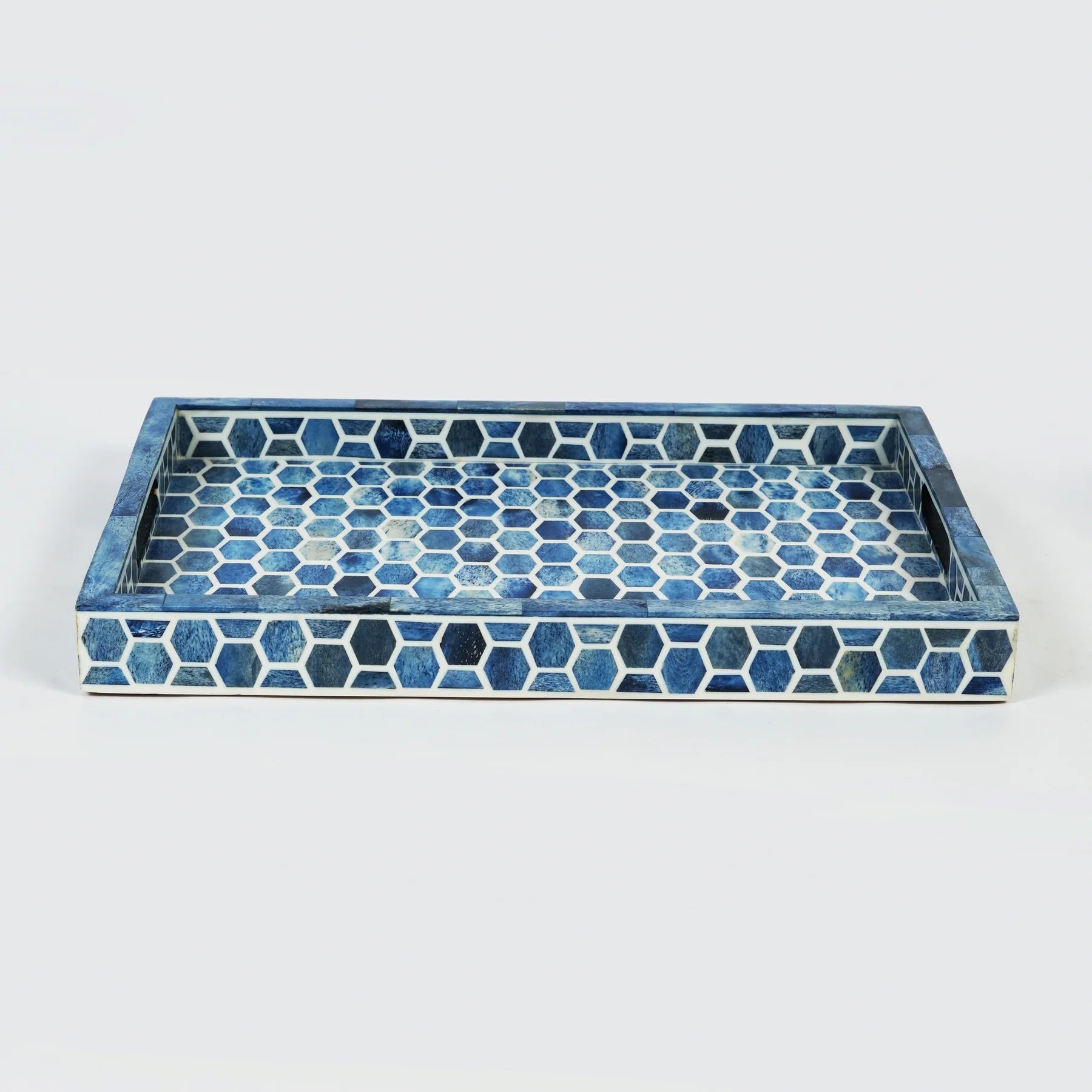 The Mela Artisans Gramercy Inlay Tray makes a bold statement with its hand-inlaid bone and resin design, featuring a striking hexagonal pattern in deep indigo and crisp white. Each piece reflects meticulous craftsmanship, blending modern geometry with timeless appeal.