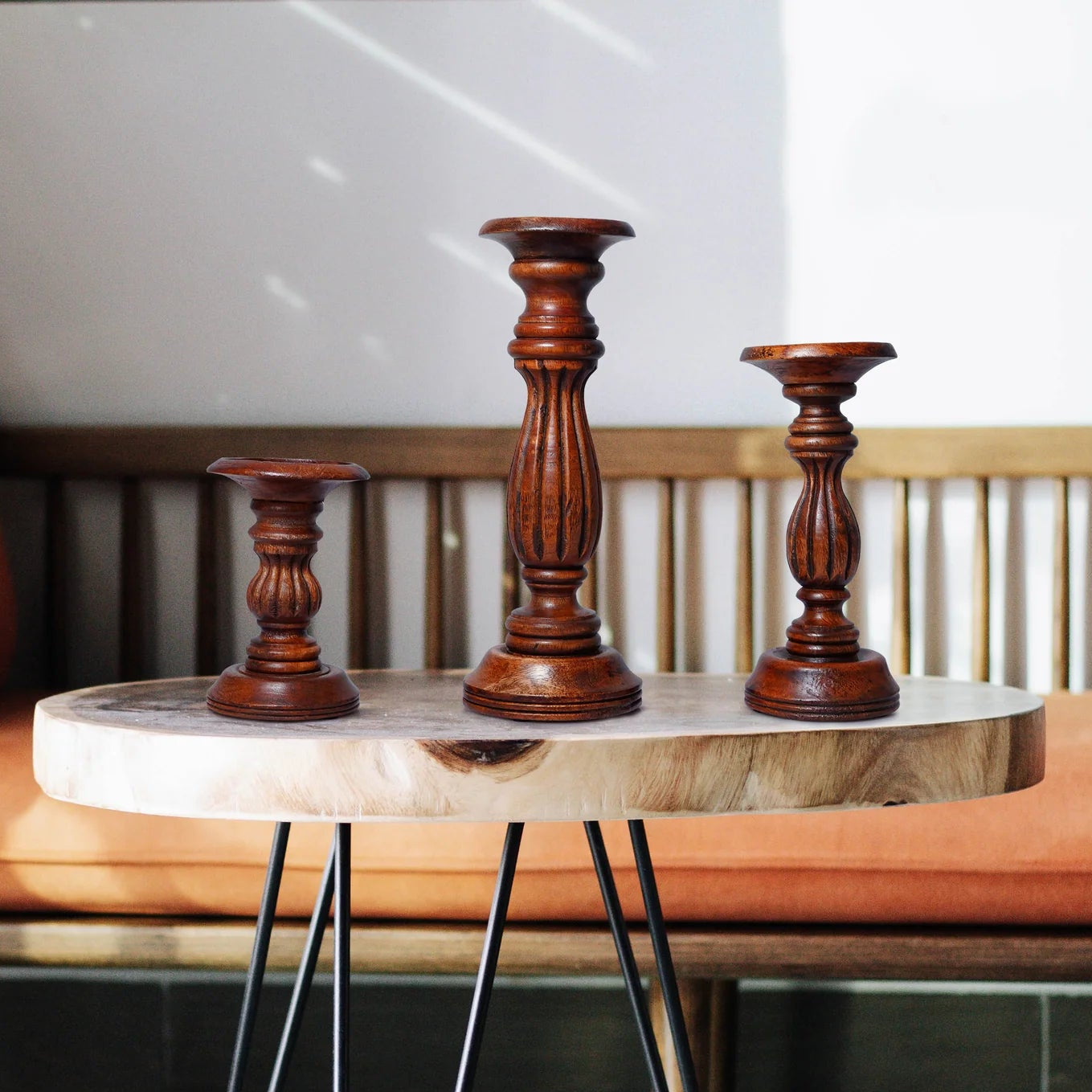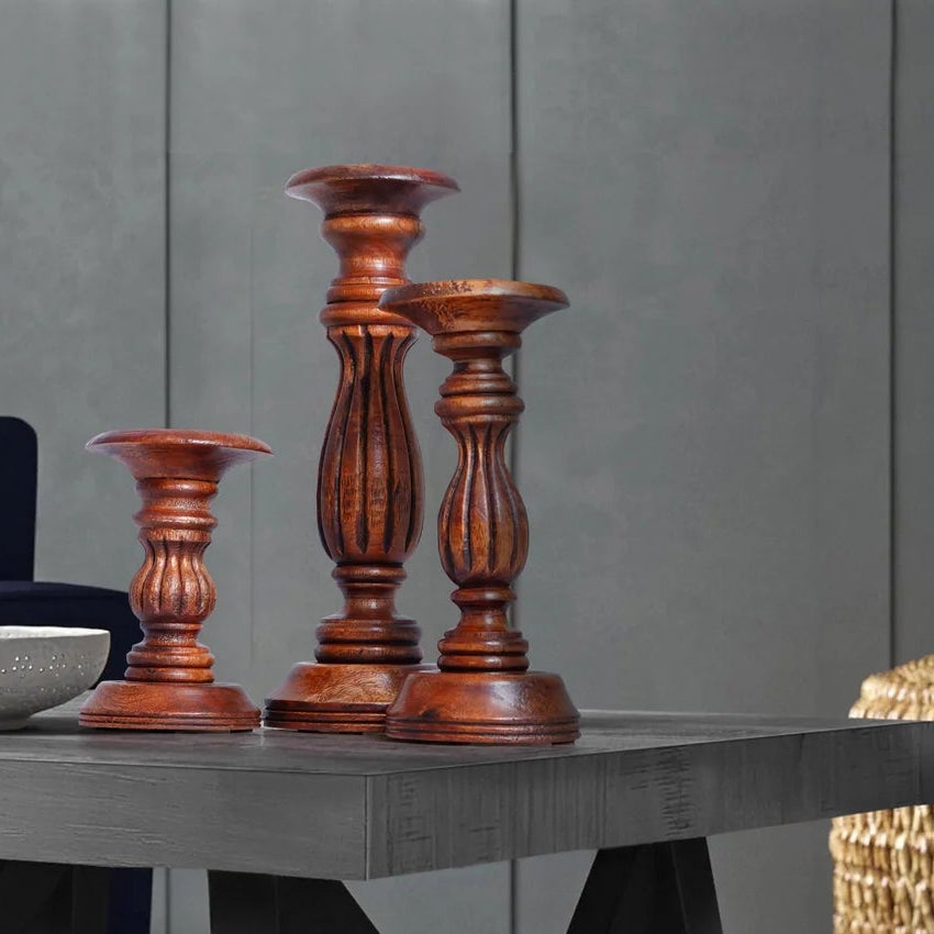 The Mela Artisans Hana Medium Polish Candleholder Set of 3 embodies timeless elegance and natural warmth. Handcrafted from wood by skilled artisans, each holder features a smooth silhouette and graceful design that complements pillar candles beautifully.