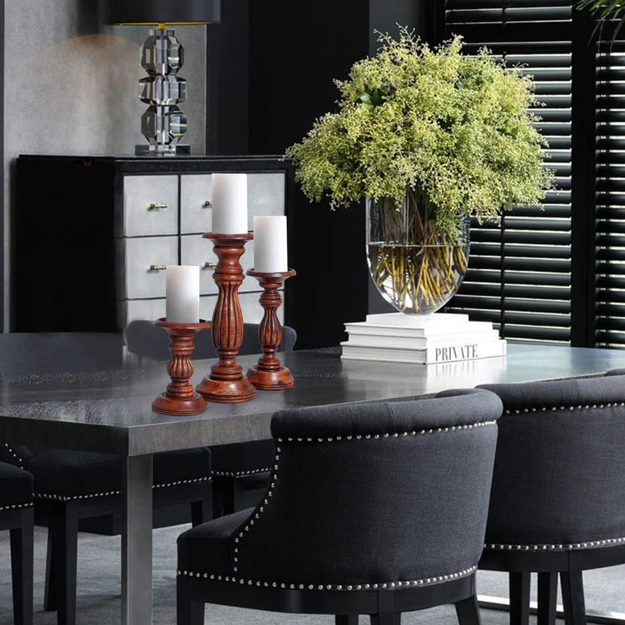 Ideal for mantles, dining tables, or entryways, they cast a soft, inviting glow while serving as refined decorative accents. A versatile choice for both everyday ambiance and special gatherings. Small 6"H, Medium 9"H and Large 12"H. Set of 3.
