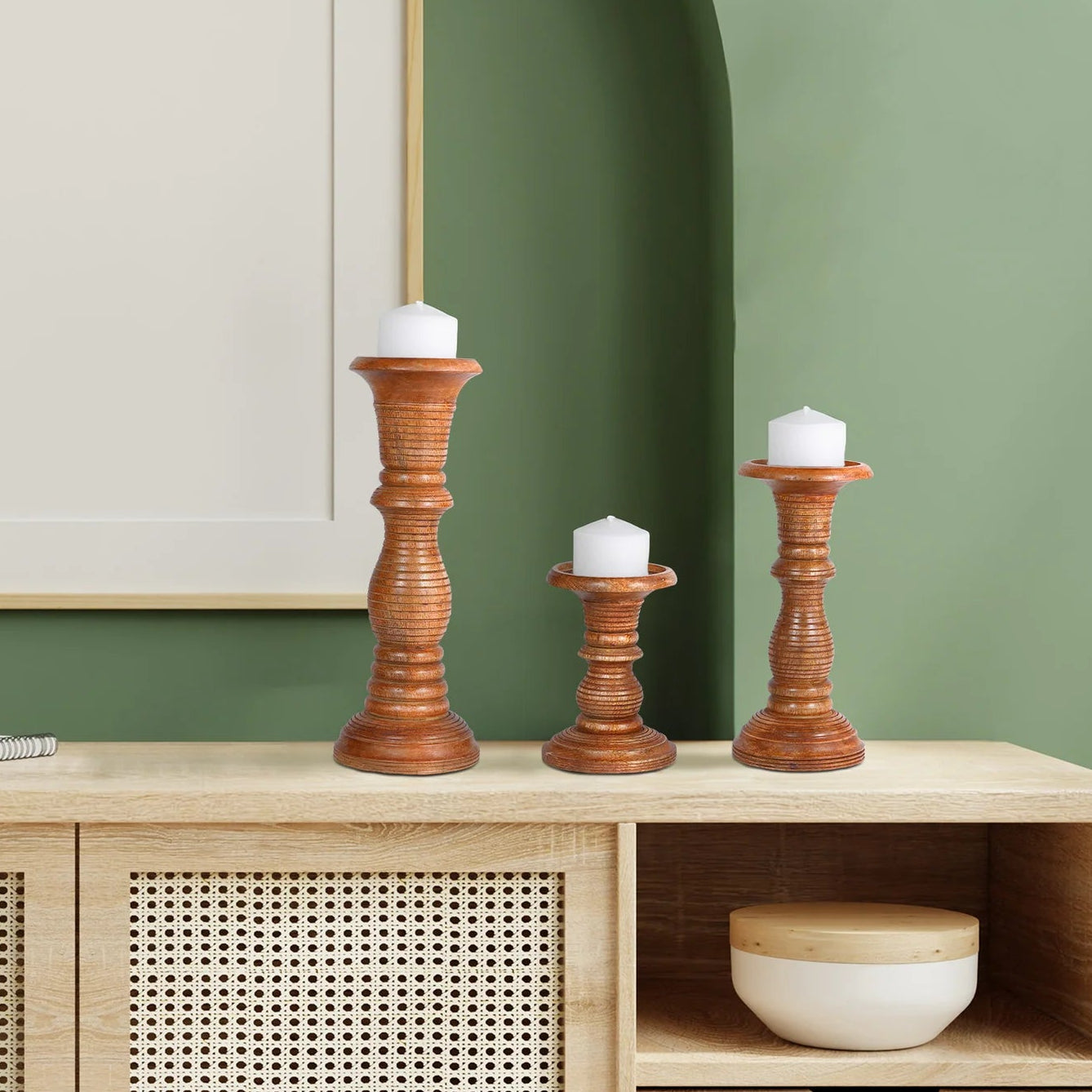 The Mela Artisans Jharna Pillar Candleholder Set of 3 brings a touch of timeless artistry to any space. Crafted with smooth curves, detailed carvings, and a softly distressed finish, each holder highlights the beauty of traditional lathe craftsmanship. Perfect for displaying pillar candles, these pieces infuse warmth and character into mantles, dining tables, or living room accents.