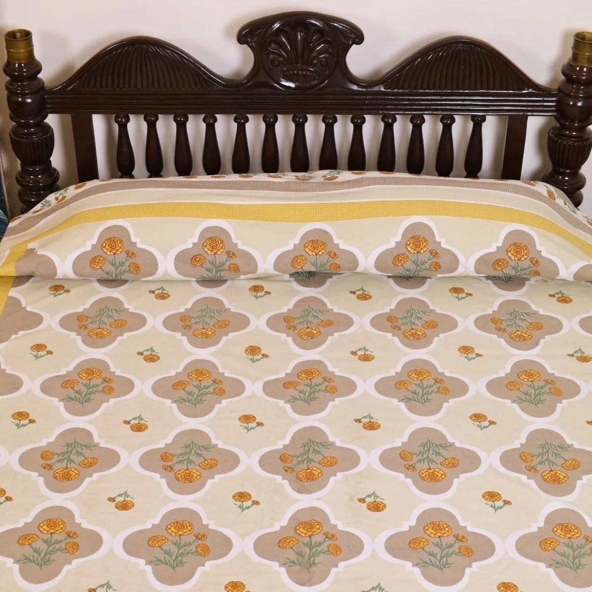 Add comfort and style to your bedroom with this Mela Artisans Marigold Bed Cover. Featuring a hand-printed design inspired by traditional jaali patterns, it showcases calming shades of ivory, taupe, and soft yellow.