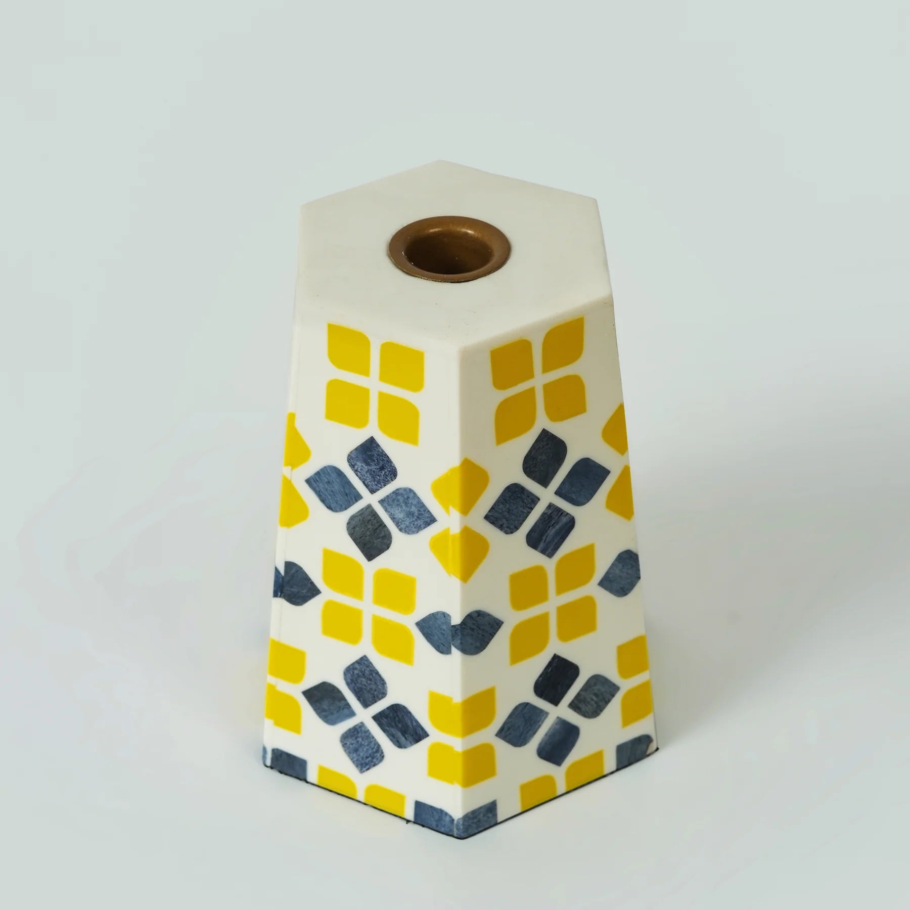 A warm glow meets timeless craftsmanship in this Mela Artisans Marigold Mosaic Inlay Candleholder, featuring a vibrant marigold mosaic in bone and resin.