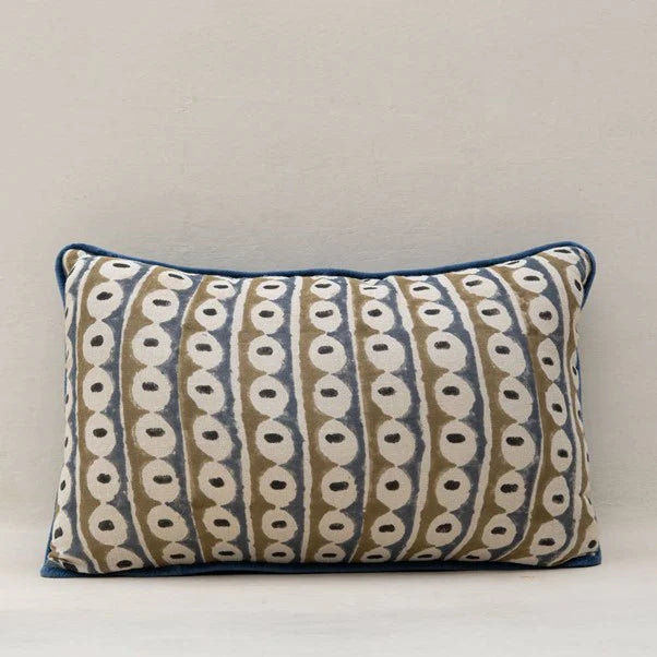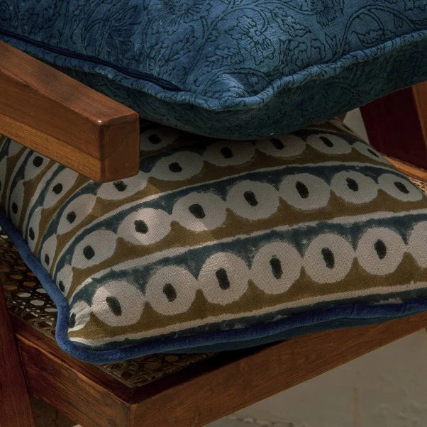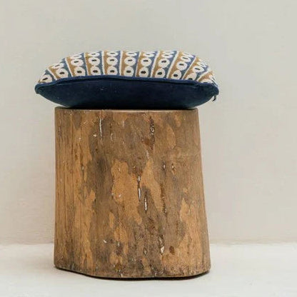 A bold accent with quiet strength, the Mela Artisans Nazar Blockprint Pillow Cover is hand block printed in Jaipur using traditional carved wooden blocks and AZO-free dyes. Crafted from 100% cotton, it features a rhythmic blue and taupe motif believed to ward off negative energy, blending meaning with modern geometry. Each piece carries subtle variations that reflect its handmade artistry.