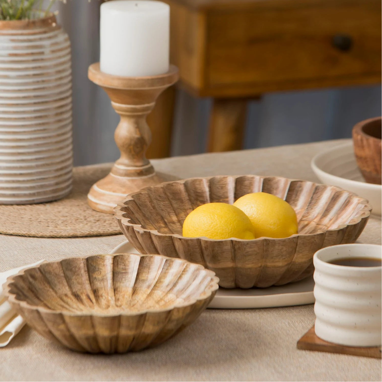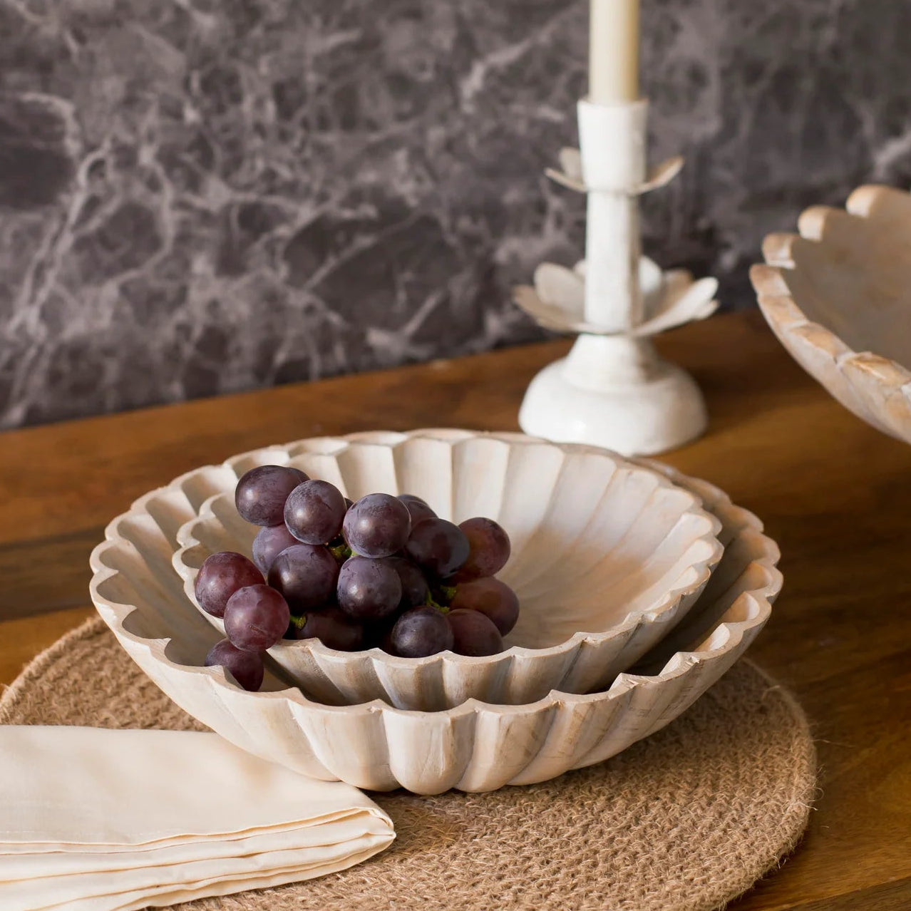 Crafted by skilled artisans, this Mela Artisans Scallop Serenity Bowl Set of 2 adds elegance and texture to any tabletop or shelf. Featuring a scalloped edge and soft whitewashed tones, each bowl blends rustic charm with refined sculptural detail.