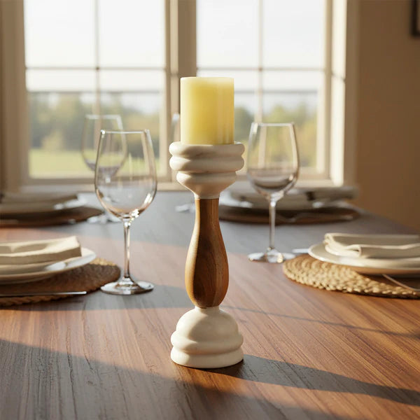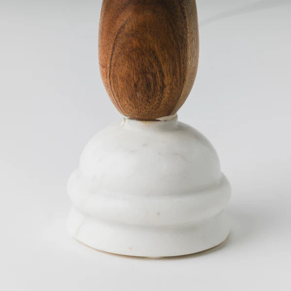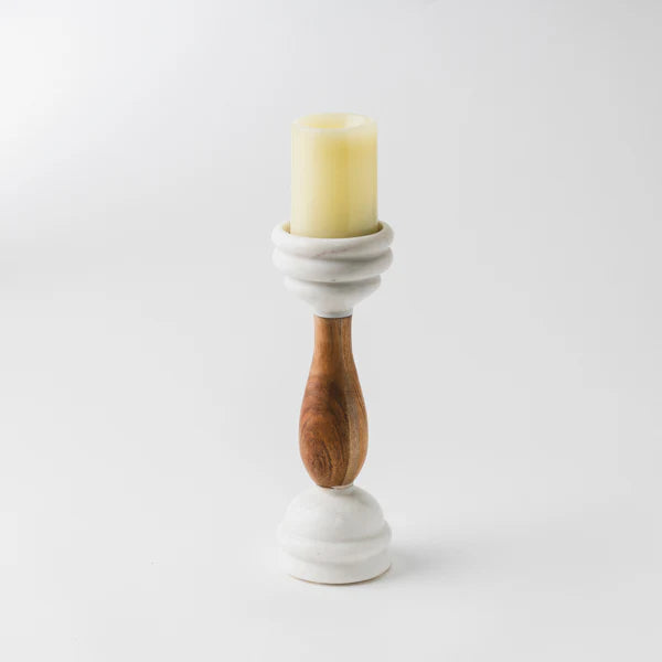 Elegant and architectural, this Mela Artisans Signature Pillar Candleholder pairs the warmth of natural acacia wood with the cool refinement of hand-carved marble. Available individually in black or white marble, each piece features a beautifully contoured silhouette that brings quiet artistry and visual presence to dining tables, consoles, and mantels.