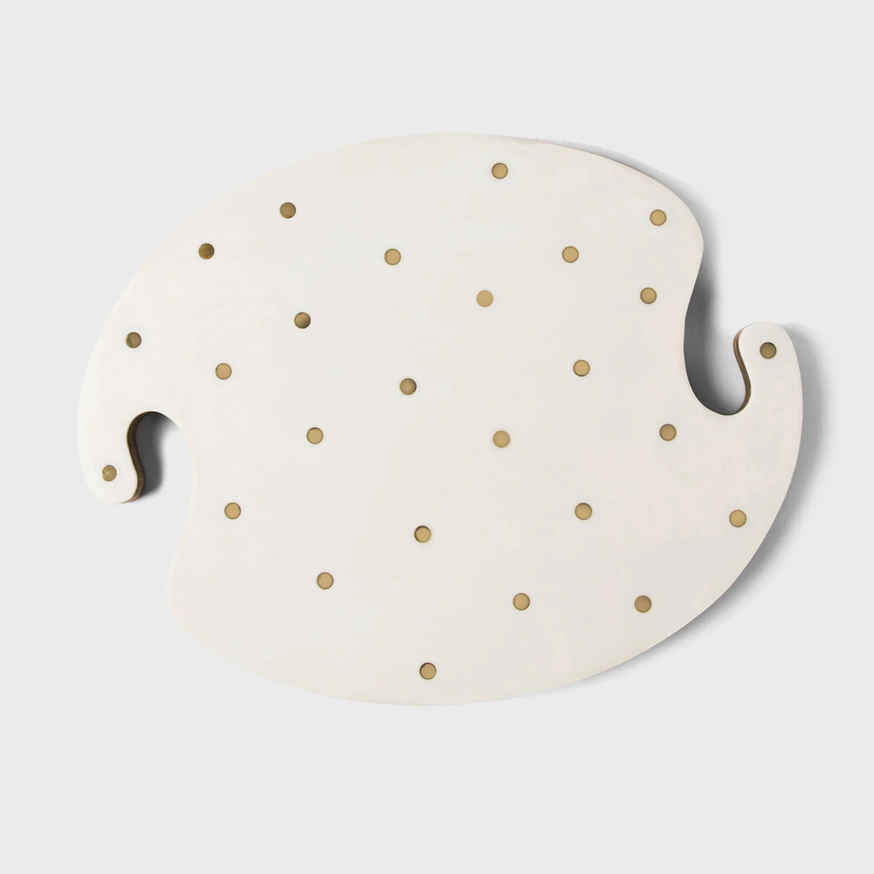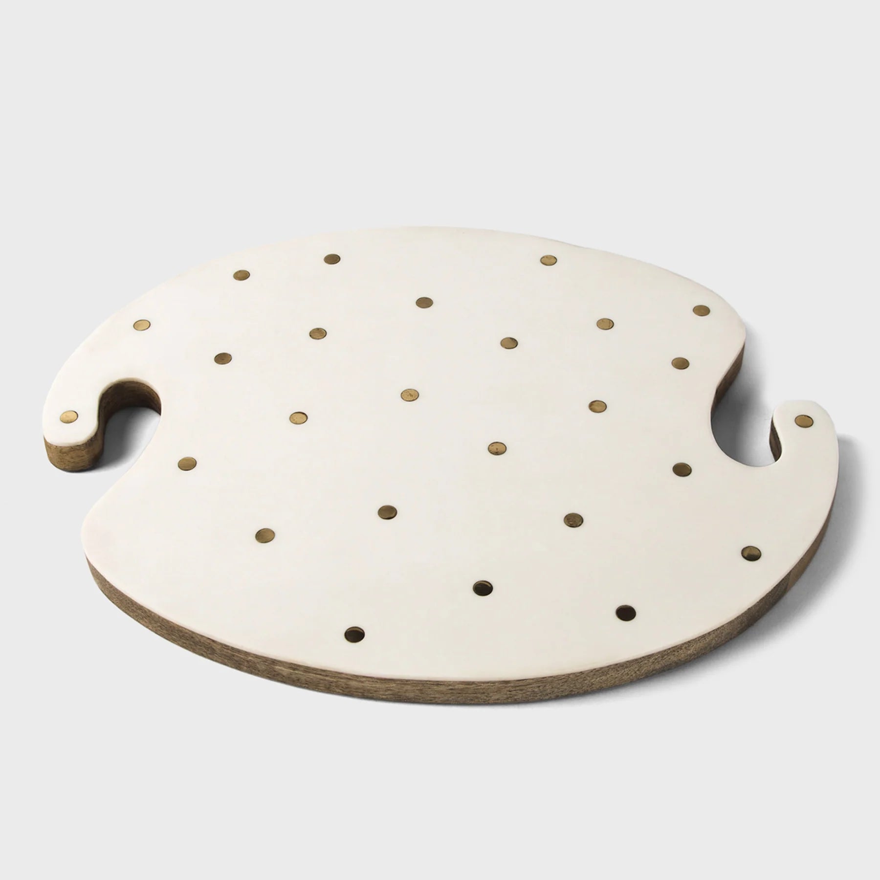 Add a starry accent to the table with the Mela Artisans Sitara Serving Board, artfully hand inlaid with gleaming brass dots that evoke a festive night sky. Designed for serving cheese, charcuterie, or celebratory treats, it balances everyday function with decorative appeal while bringing warmth and visual interest to gatherings. 14"L x 11"W.