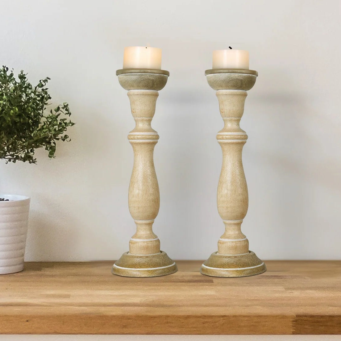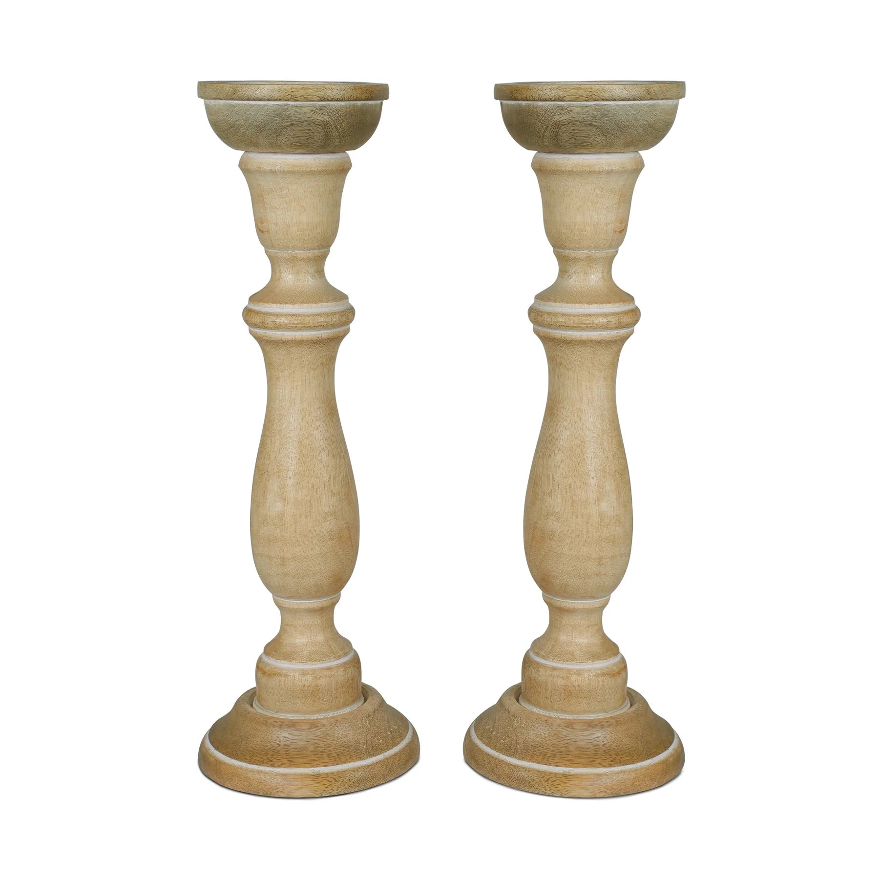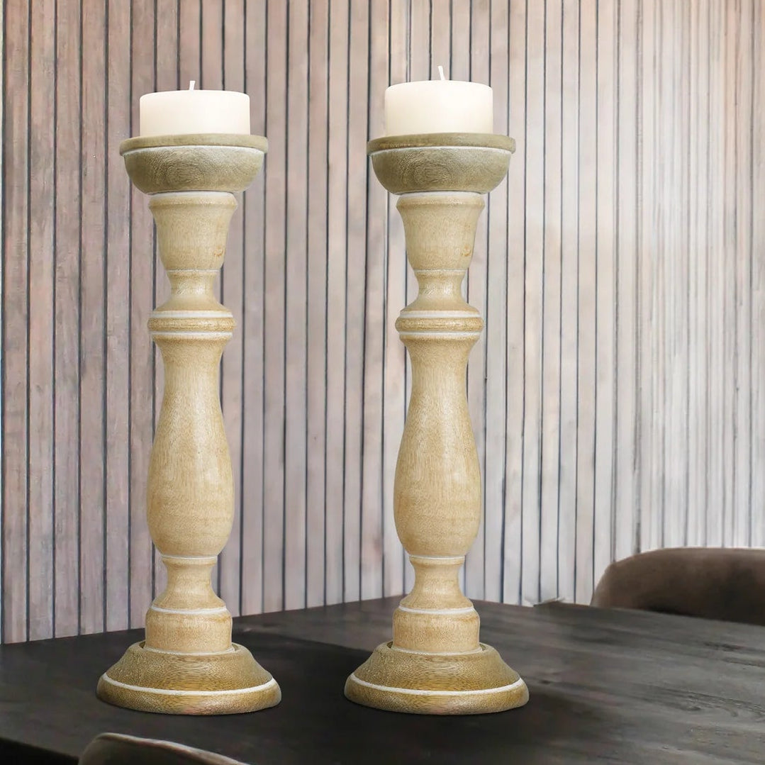 The Mela Artisans Tuli Rustic White Pillar Candleholder Set of 2 combines timeless elegance with handcrafted artistry. Made from wood and shaped with graceful curves, each holder is designed to beautifully display tall pillar candles. The refined finish and warm tone bring an inviting glow to dining tables, mantles, or entryways, enhancing any space with understated sophistication. 15"H. Set of 2.