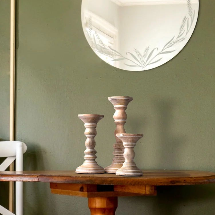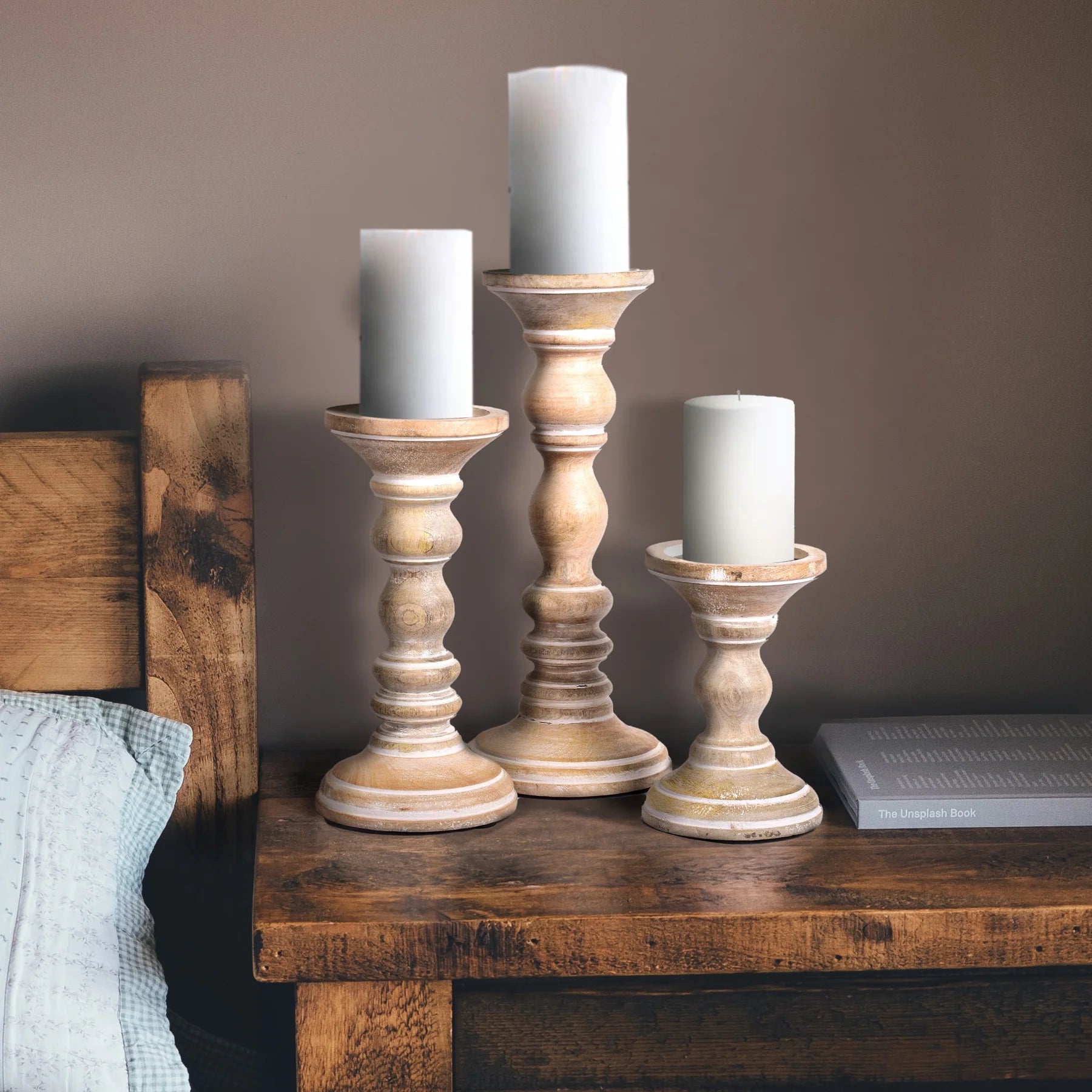 These Mela Artisans Willow Rustic White Pillar Candleholder Set of 3 bring an earthy, handcrafted charm to any setting. Each piece is artisan-made with detailed grooves and a softly whitewashed finish that highlights the beauty of the wood. Designed in varying heights, they create a harmonious display on dining tables, consoles, or shelves.