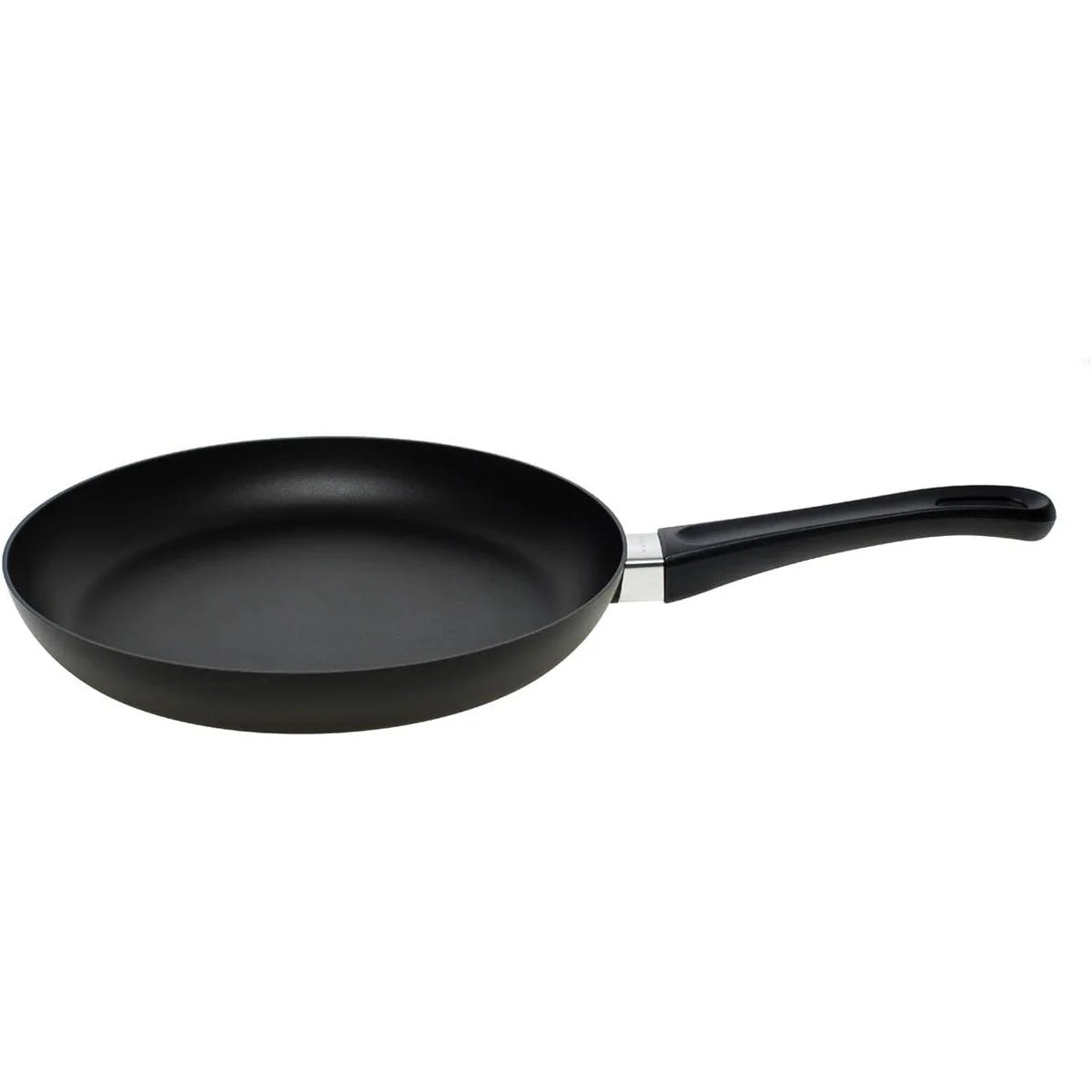 The Scanpan Classic Fry Pan offers reliable performance for everyday cooking, featuring a patented ceramic titanium nonstick surface that withstands metal utensils without peeling. Crafted from 100% recycled squeeze-cast aluminum, it ensures excellent heat distribution and is oven safe up to 500°F. The rivet-free locking system adds durability and makes cleaning easy. Suitable for all stovetops except induction. Made in Denmark.