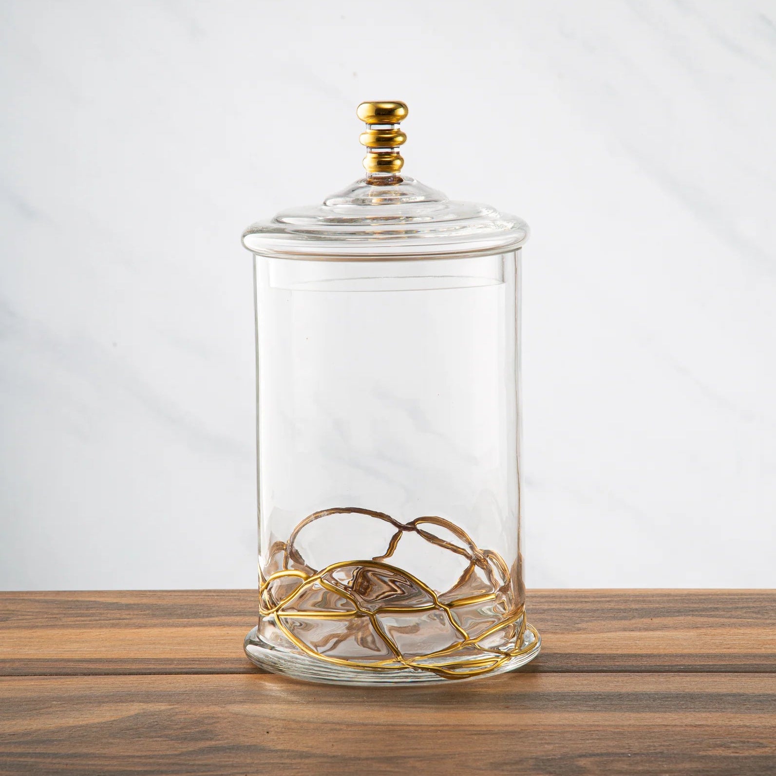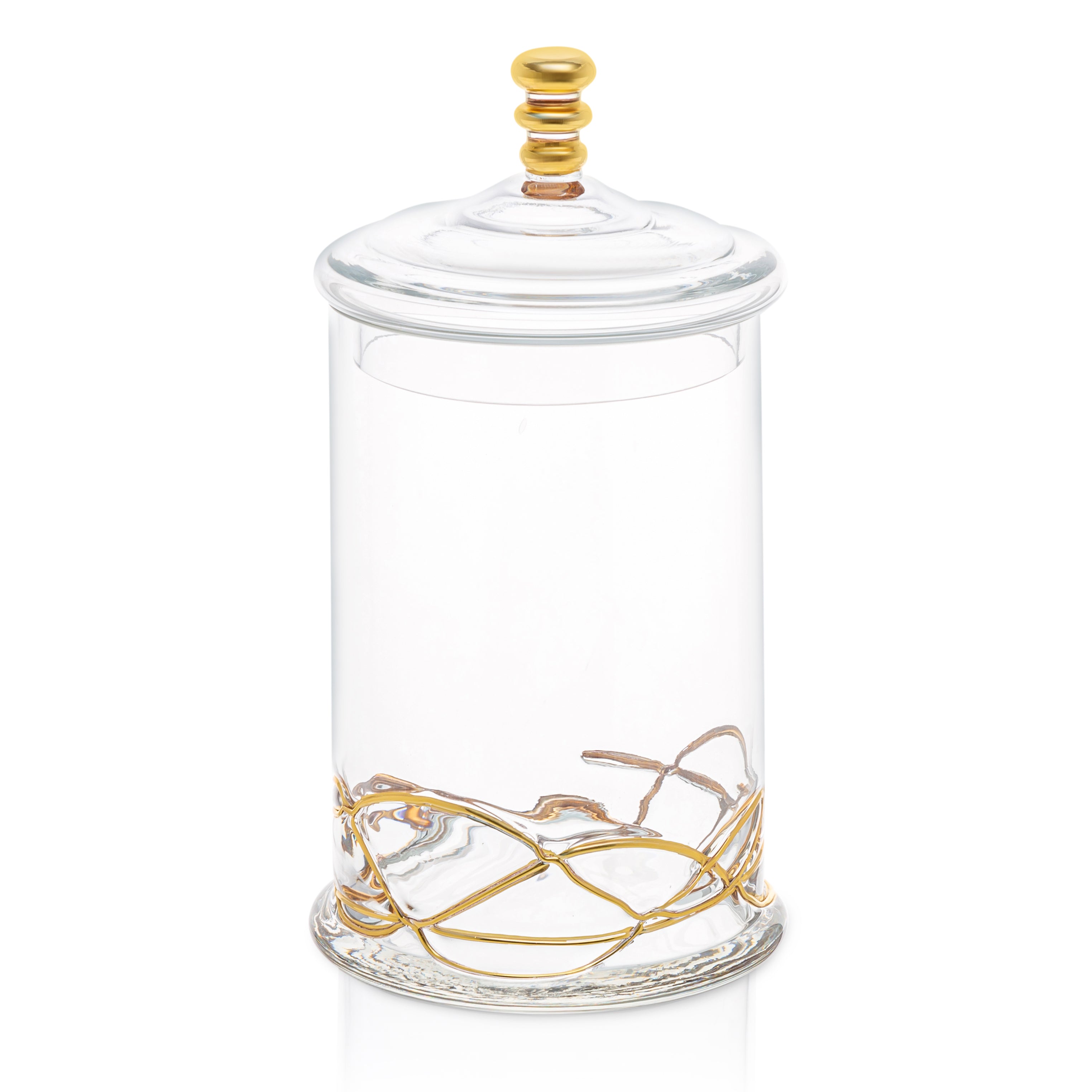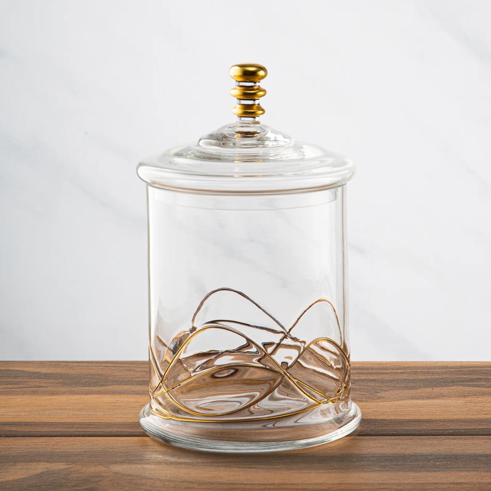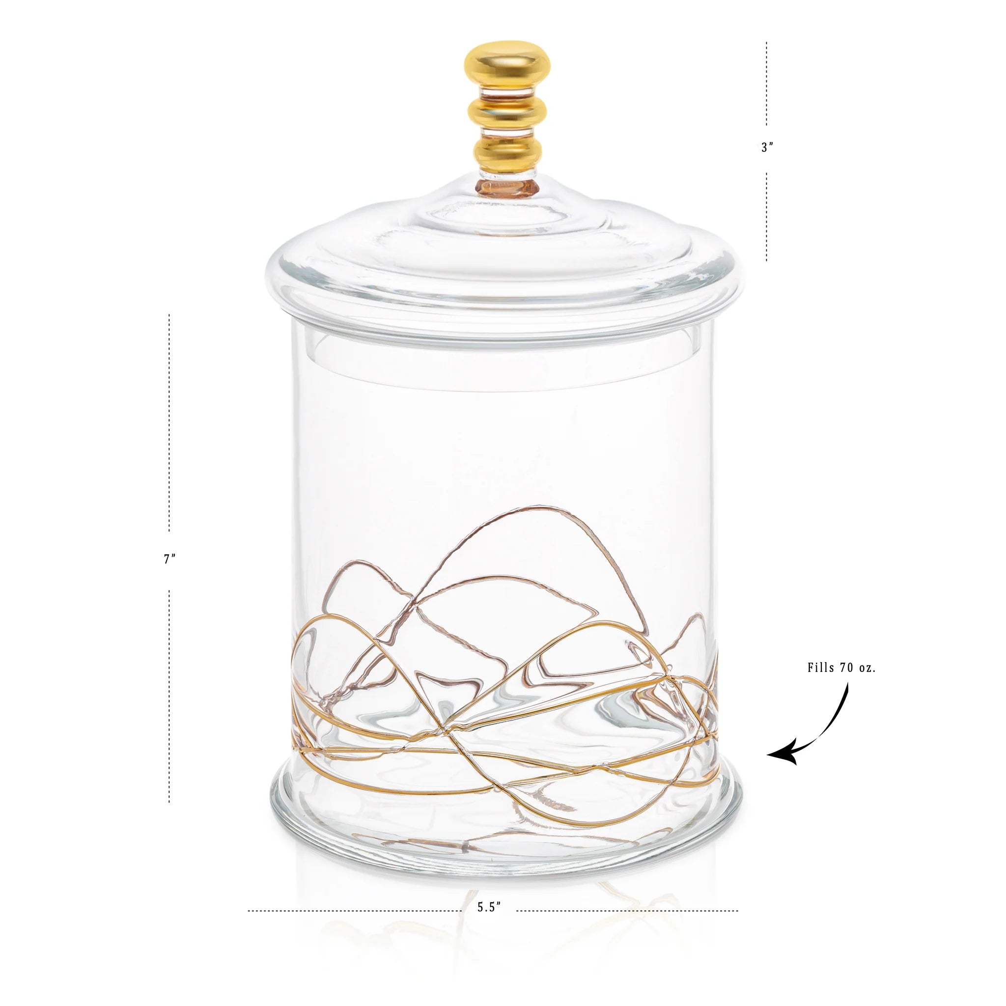 Finely sculpted from clear glass and adorned with an elegant wired gold design, this Classic Touch 14k Gold Swirl Glass Jar with Lid brings refined charm to everyday storage. Its air-tight lid helps preserve the freshness of baked goods, cookies, and pastries while adding a touch of sophistication to the kitchen or countertop.